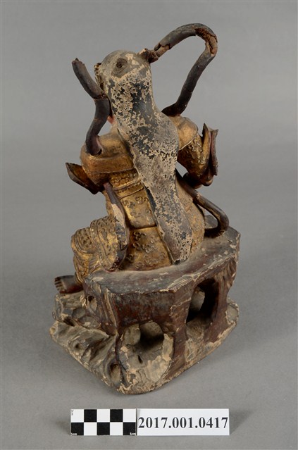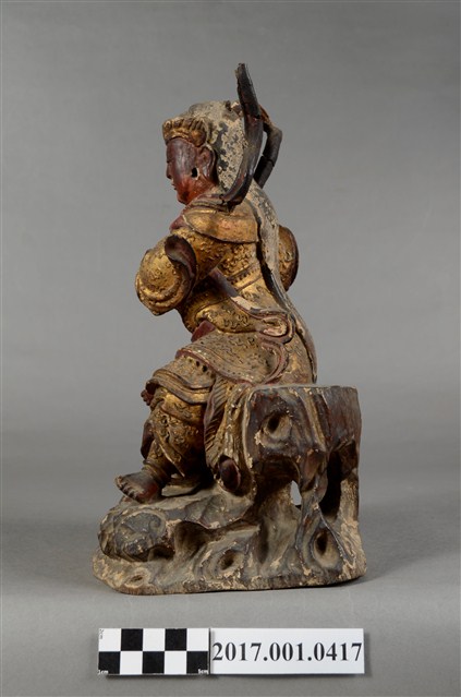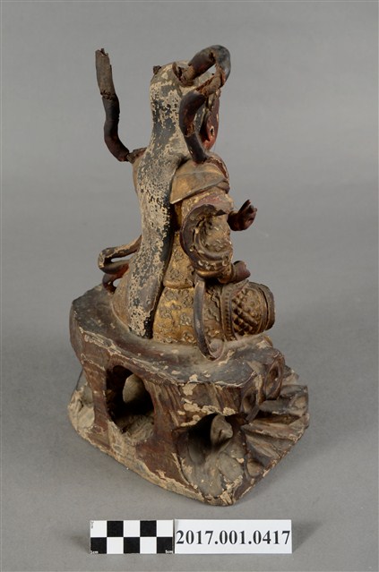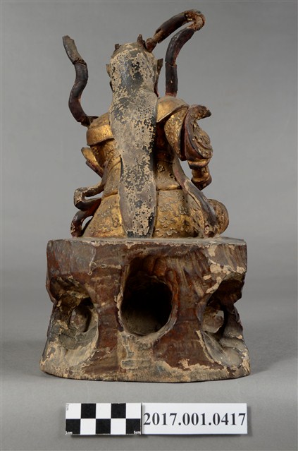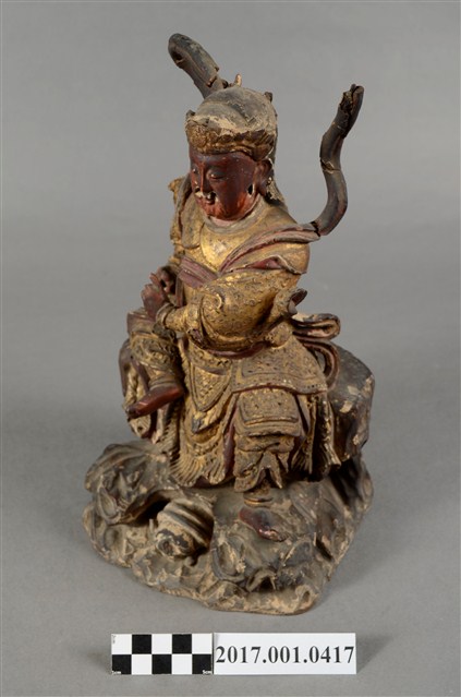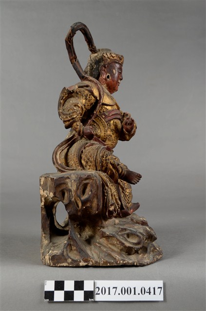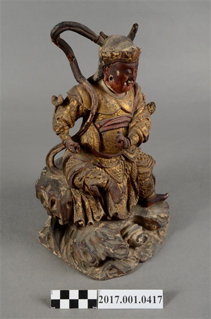1.本件木雕玄天上帝像,作坐姿姿態,端坐於岩座上,表面施作塗裝、安金不見紅粉線盤飾粧佛技法,局部粧佛剝落。臉型輪廓橢圓,顏面表現雙目半睜,鼻翼兩側、下顎、兩頰有植鬚孔,鬍鬚已脫落遺失。頭戴兜鍪,披髮,身著盤領衣、雙腳著長褲,肩頸披著披膊與護肩,腰束腰帶,護腹以腰帶固定,正面的腰帶下有前擋與左右擋鎧甲,鎧甲表現甲冑紋,披飄帶,飄帶部分斷裂,跣足,左腳向左前外推,右腳翹起,左手橫於腹前,手掌結特有之玄帝指,右手握拳持物屈肘向下,持物已遺失,衣袖向後揚起。岩座前下方有龜蛇盤繞,龜首損毀。