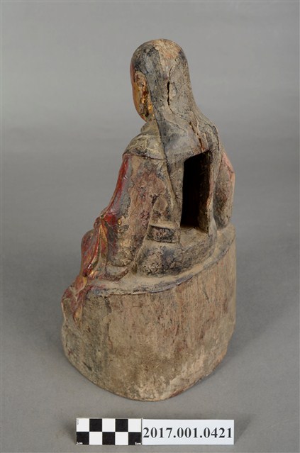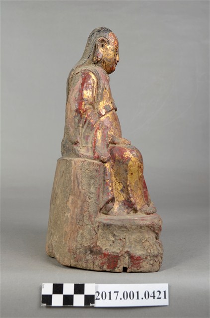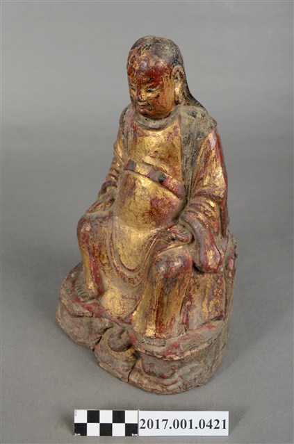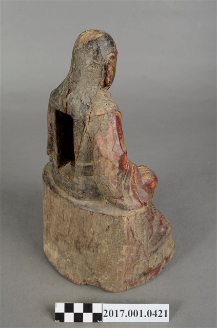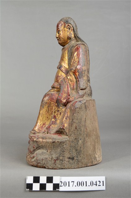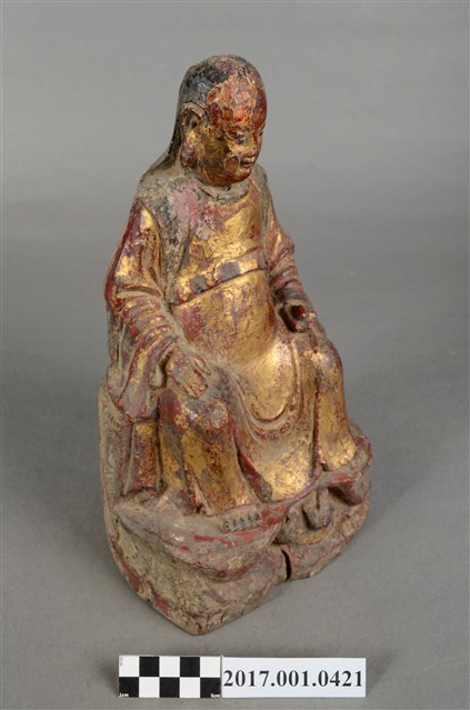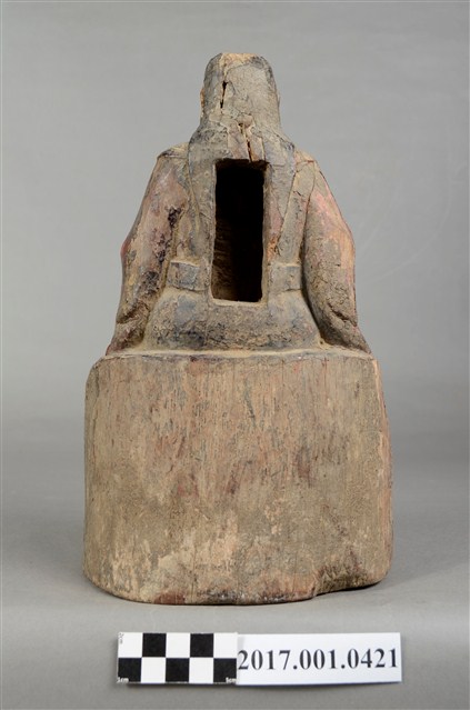 1.本件木雕玄天上帝像,作坐姿姿態,表面施作塗裝、安金不見紅粧佛技法,安金層局部褪去,背面開有長方形入神洞,內部物件已取出。臉型輪廓橢圓,雙眼圓睜,嘴邊鬍鬚脫落,披髮無冠。身著盤領衣,肚腹圓凸,腹上束腰帶。跣足,端坐於岩座上,雙足自然垂下,左手翻掌向上,捻指訣置於腿上,右手扶於右腿於腿上。岩座前下方有岩洞,洞內雕刻龜蛇盤繞。