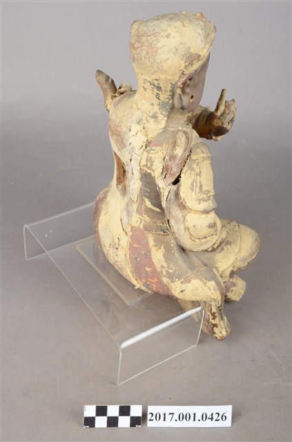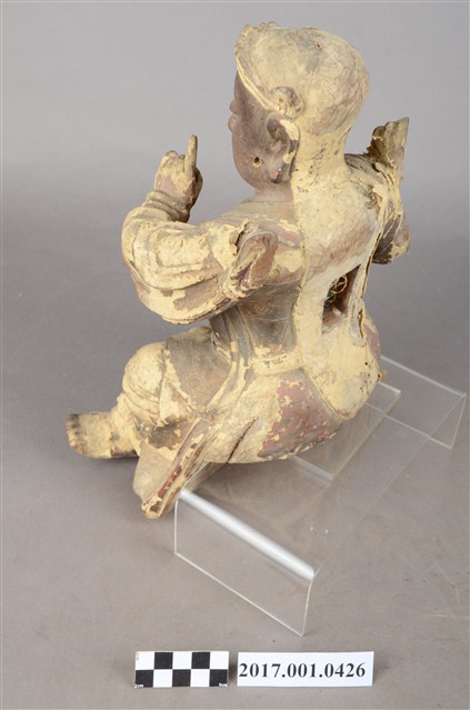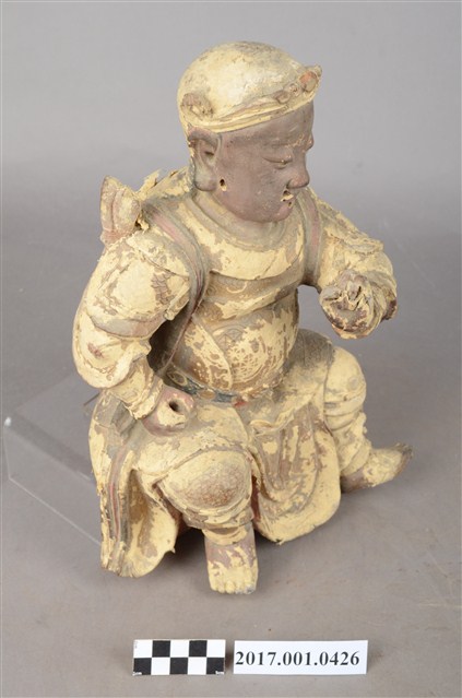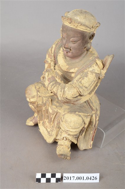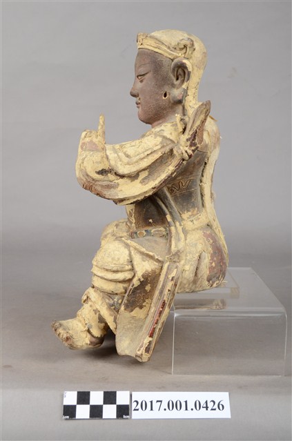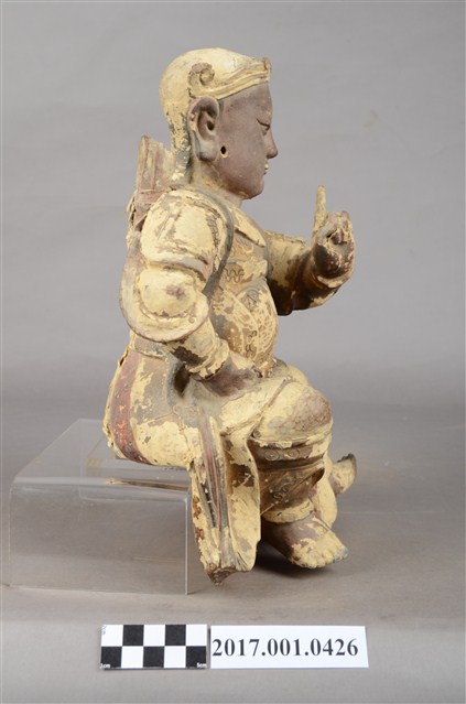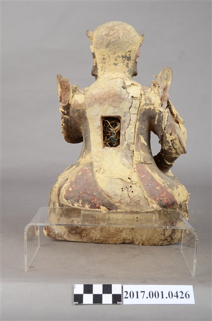 1.本件木雕玄天上帝像,作坐姿姿態,屬「脫椅」作法,臺座已遺失,表面施作塗裝、安金不見紅漆線盤飾粧佛技法,局部粧佛剝落,背面開有長方形入神洞,封榫佚失,露出內部入神之五色線。臉型輪廓橢圓,顏面表現雙目半睜,鼻翼兩側、唇下、兩頰有植鬚孔,鬍鬚已失。頭戴兜鍪,披髮,身著盤領衣,雙腳著長褲,肩頸披著披膊與護肩,腰束腰帶,護腹以腰帶固定,腰帶表現獸頭,正面的腰帶下有前擋與左右擋鎧甲。左手結玄帝指訣橫伸向右,右手握拳置於腿上,手中持物已失,雙手袖口向後揚起。雙足垂下,跣足,左腳向左前方外推,右腳內縮,作「文武腳」姿態。