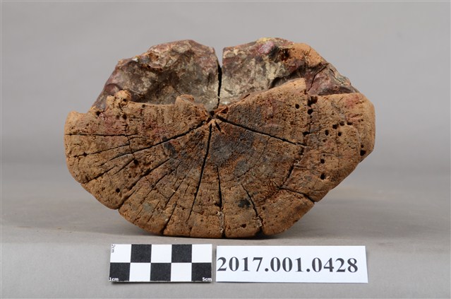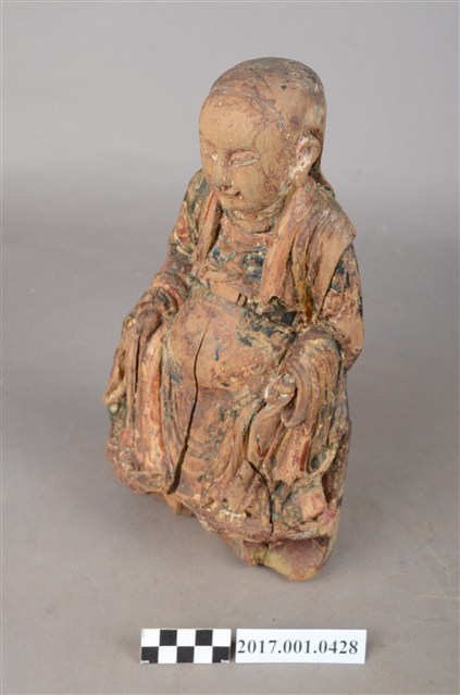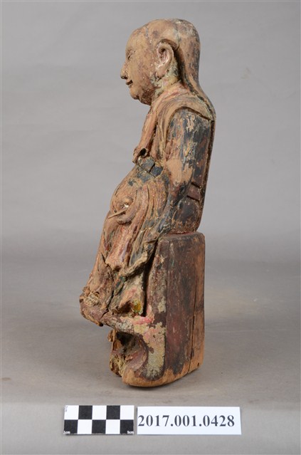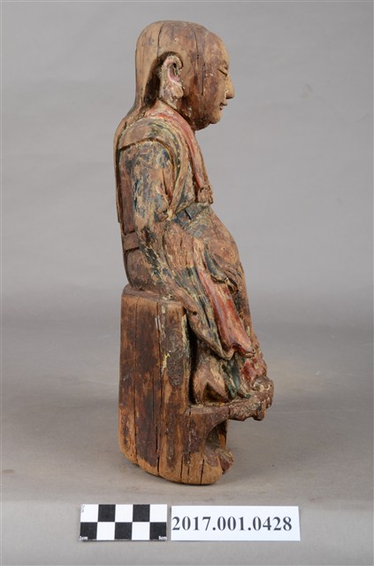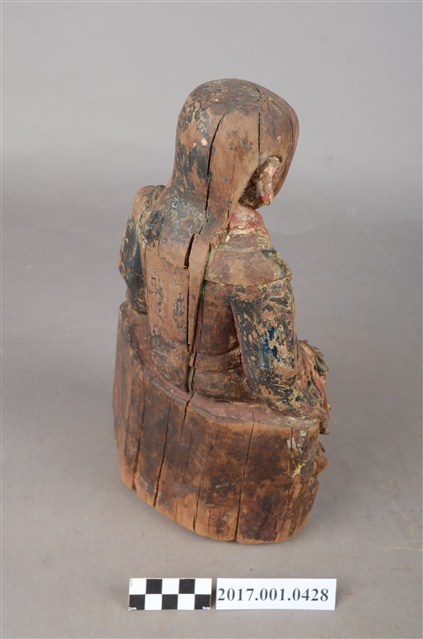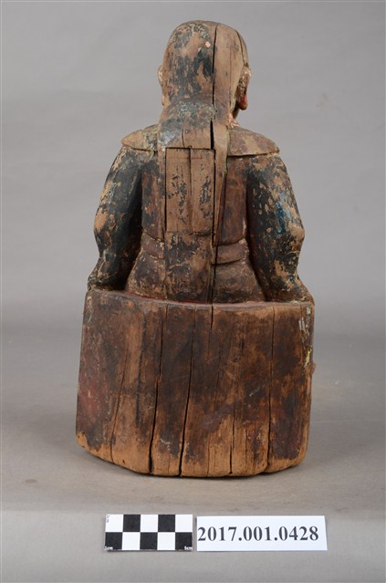 1.本件木雕玄天上帝像,作坐姿姿態,端坐於岩座上,粧佛已褪去,背面開有長方形入神洞,封榫尚存。臉型輪廓橢圓,披髮,身著黑色盤領衣,外罩開襟罩衫,肚腹圓凸頂著腰帶,下身中央一道縱裂紋自腹部延伸至踏几。左手結玄帝指訣置於左膝,右手扶於右膝。雙腳跣足,自然垂下,平踩於座前踏几上,踏几下方蛀蝕破裂。