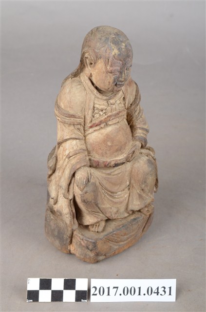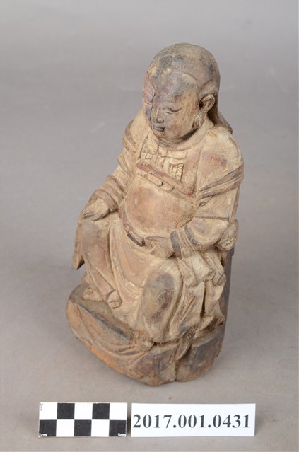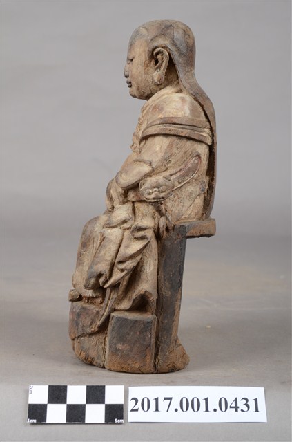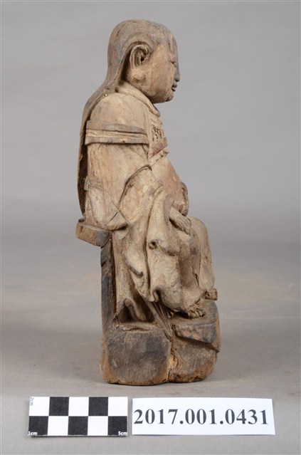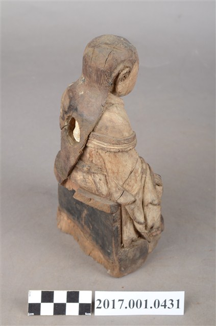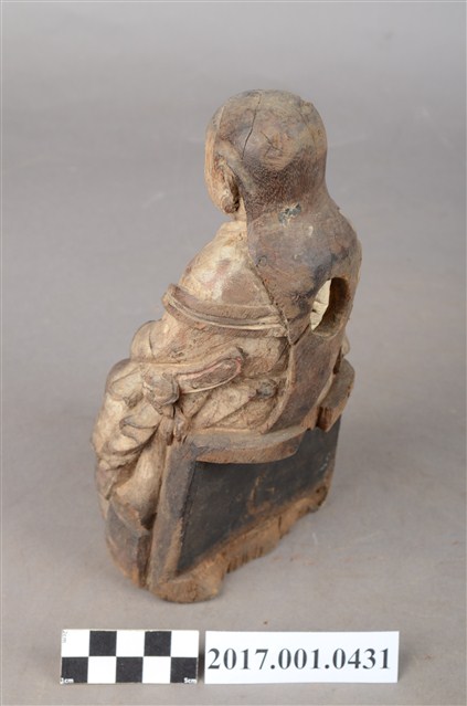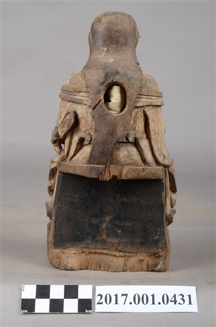 1.本件木雕玄天上帝像,作坐姿姿態,端坐於臺座上,粧佛已褪去,背面開有圓形入神洞,封榫佚失,露出內部入神命書。臉型輪廓橢圓,披髮,身作「衷甲」式裝束,內著鎧甲,外套寬袖罩衫、長裙,肚腹圓凸,腰繫玉帶,胸前有看帶,跣足。挺身端坐,雙足垂下,左腳向左前方外推,右腳向內,作「文武腳」姿態,右手掌放於腿上,左手握玉帶。臺座後方挖空,下端缺損。