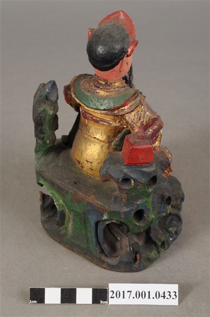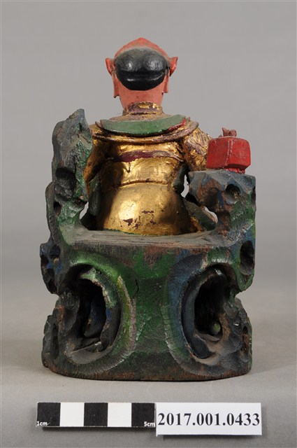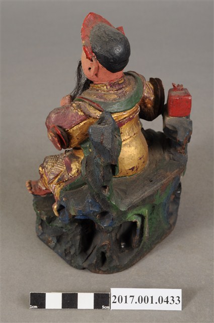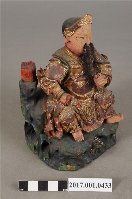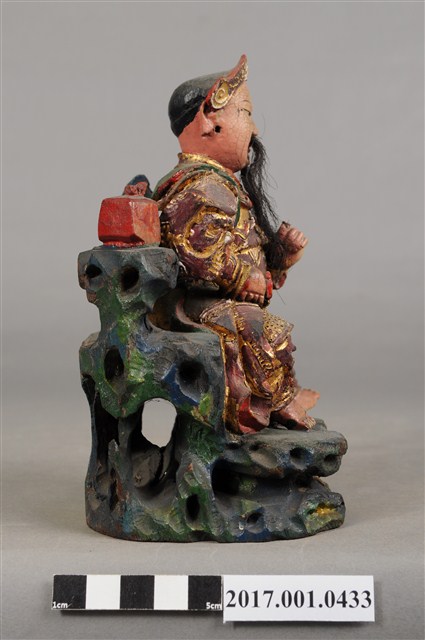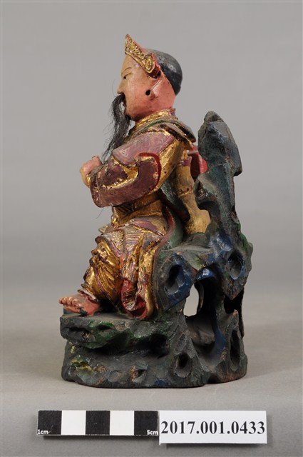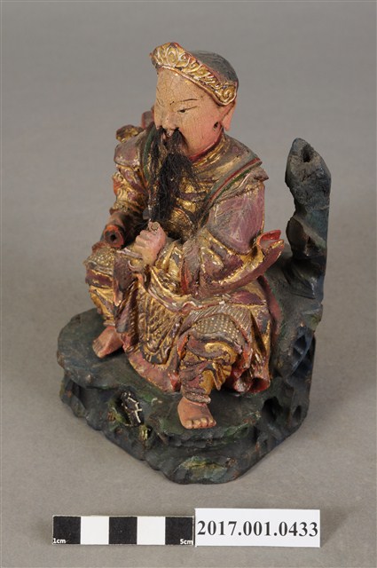 1.本件木雕玄天上帝像,作坐姿姿態,端坐於岩座上,表面施作塗裝、安金不見紅錦雕粧佛技法,局部粧佛剝落。臉型輪廓橢圓,顏面表現中年男子相貌,丹鳳眼,長耳,鼻翼兩側、下顎有植鬚孔,鬍鬚部分脫落。頭戴兜鍪,披髮,身著盤領衣,肩頸披著披膊與護肩,腰束腰帶,護腹以腰帶固定,腰帶表現獸頭,正面的腰帶下有前擋與左右擋鎧甲,鎧甲錦雕表現甲冑紋衣袖下襬向後方揚起,雙腿著長褲,跣足。左手向內平舉虛握,作捻鬚狀,右手曲肘握劍置於右腿上,劍刃佚失僅殘留護手。雙足垂下,左腳向左前方外推,右腳內縮,作「文武腳」姿態。身右岩柱頂端一只印盒方函,岩座下方岩洞內有龜。