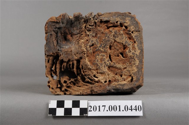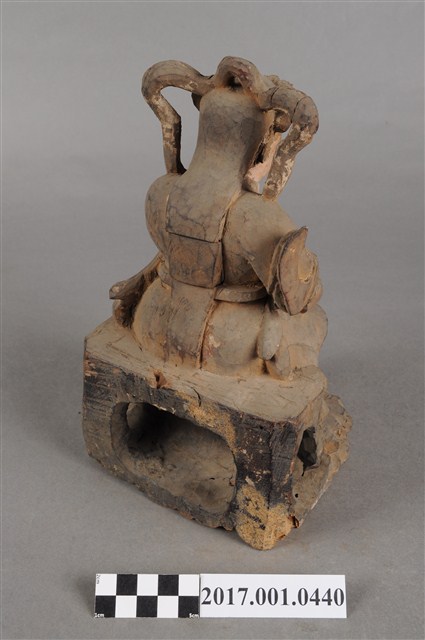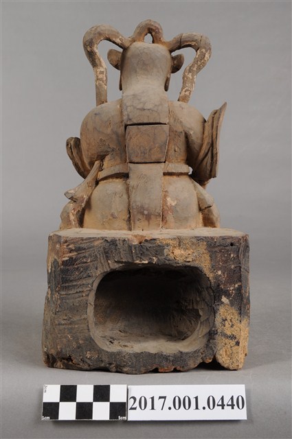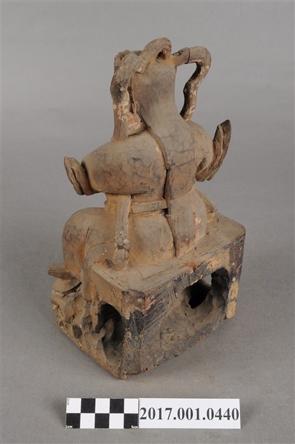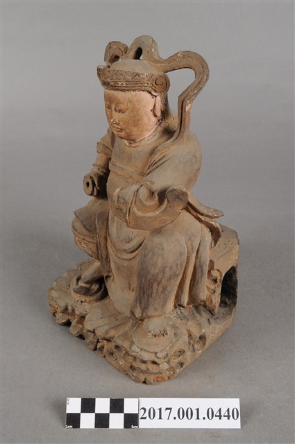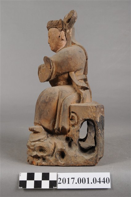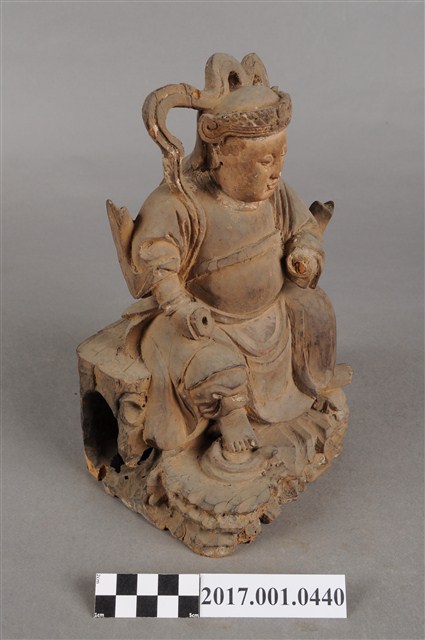 1.本件木雕玄天上帝像,作坐姿姿態,坐於岩座上,粧佛已褪去,背部開有方形入神洞,封榫尚存。臉型輪廓橢圓,顏面表現壯年男子相貌,雙目半睜,下顎、兩頰有植鬚孔,鬍鬚已遺失。頭戴兜鍪,披髮,身作「衷甲」式的裝束,內著鎧甲,外著寬袖盤領衣,披飄帶,在下擺處露出鎧甲,肚腹圓凸,腹上束看帶,跣足。挺身端坐,左手橫伸向右,左手掌損毀,右手曲肘握拳握劍柄置於身右,劍刃遺失,殘留護手。雙足垂下,左腳向左前方外推,右腳內縮,作「文武腳」姿態,左腳踏龜、右腳踏蛇。