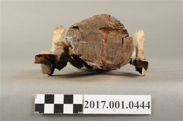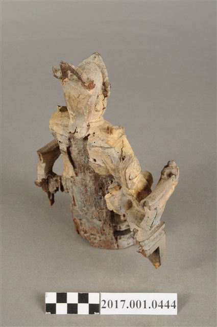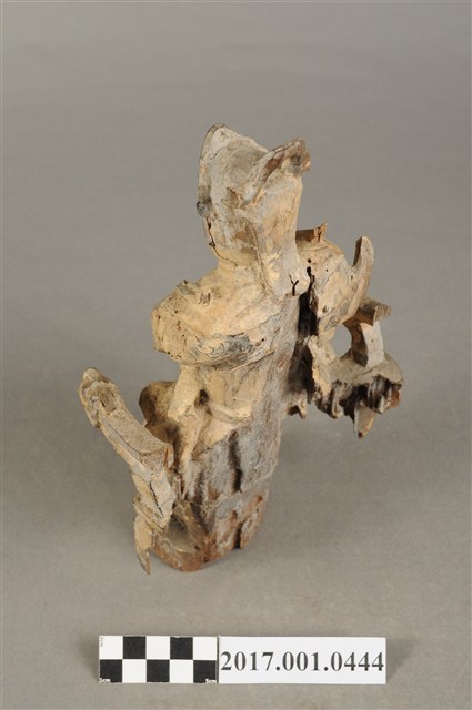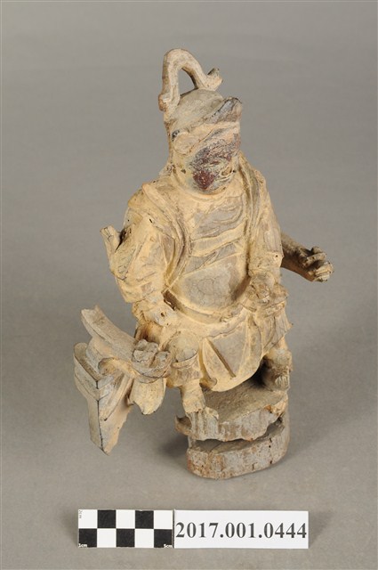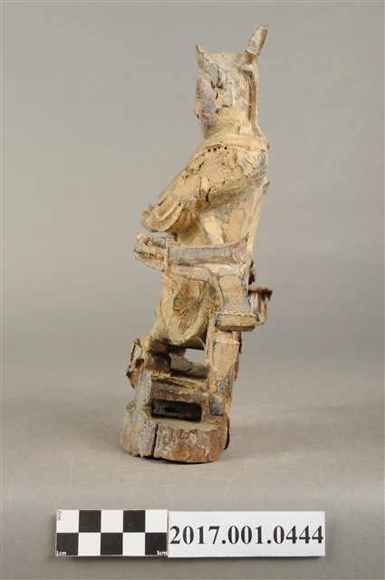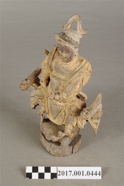 1.本件木雕玄天上帝像,作坐姿姿態,坐於圈背椅上,粧佛已褪去。臉型輪廓橢圓,顏面在下顎、兩頰有植鬚孔,鬍鬚已脫落遺失。頭戴兜鍪,披髮,身著盤領衣、雙腳著長褲,肩頸披著披膊與護肩,披飄帶,腰束腰帶,護腹以腰帶固定,正面的腰帶下有前擋與左右擋,跣足。挺身端坐,雙足垂下,左手捻指訣橫伸向右,右手握拳持物向下,持物已遺失,雙手因擺動而使衣袖揚起。圈背椅損毀嚴重。