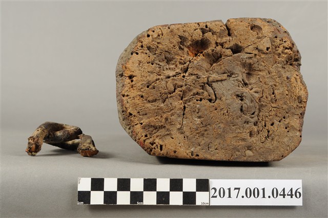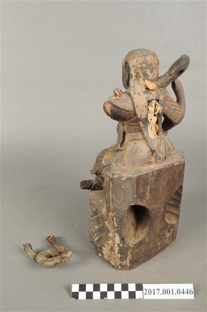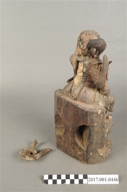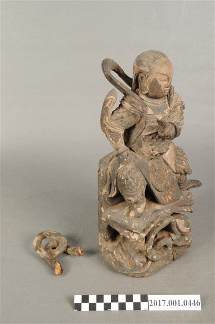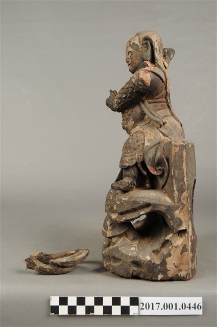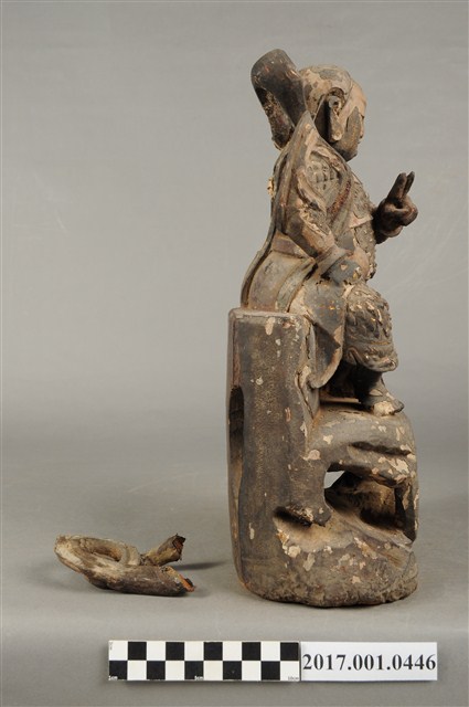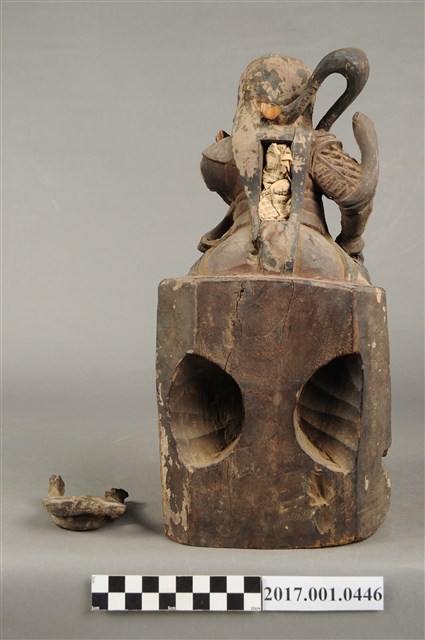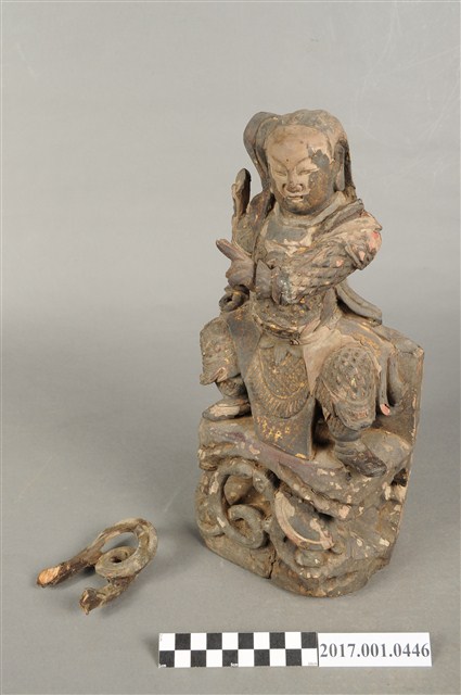 1.本件木雕玄天上帝像,作坐姿姿態,坐於岩座上,粧佛已褪去,背後開有長方形入神洞,封榫佚失,露出內部入神物。臉型方圓,頭部微轉向左,顏面表現雙目半睜。披髮,身著盤領衣、雙腳著長褲,肩頸披著披膊與護肩,披飄帶,腰束腰帶,護腹以腰帶固定,正面的腰帶下有前擋鎧甲與左右擋鎧甲,跣足。挺身端坐,左手掐劍指訣橫伸向右,右手曲肘握拳置於右腿上,持物已遺失,衣袖下襬向後揚起。雙足垂下,左腳向斜左方外推,右腳內縮,作「文武腳」姿態岩,座下雕刻龜蛇纏繞。入神洞外部所塞之紙張為簡體字報紙,應為晚近所作。