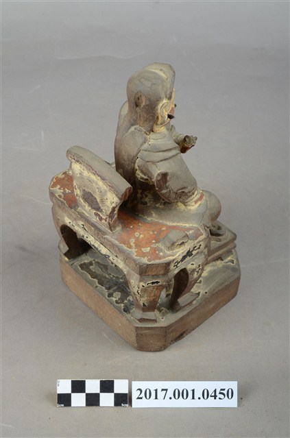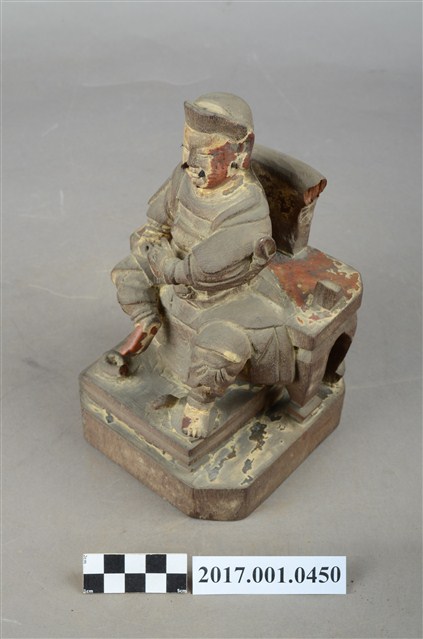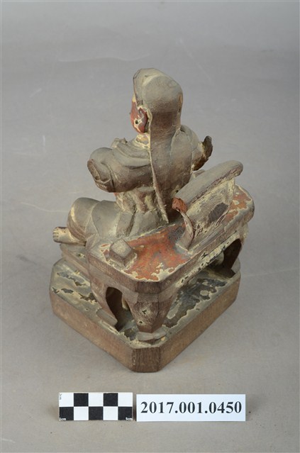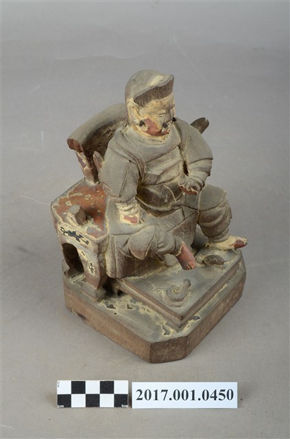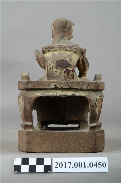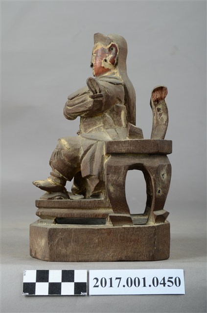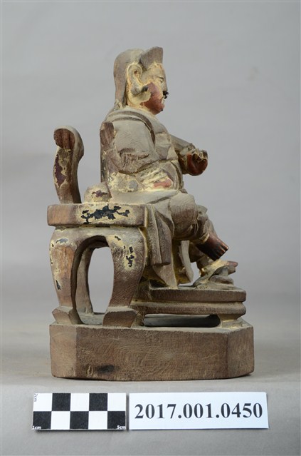 1.本件木雕玄天上帝像,作坐姿姿態,端坐於圈背椅上,粧佛已褪去。臉型輪廓橢圓,雙目半睜,鼻翼兩側、下顎、兩頰有植鬚孔,鬍鬚已脫落。頭戴兜鍪,披髮,身著盤領衣,雙腳著長褲,肩頸披著披膊與護肩,腰束腰帶,護腹以腰帶固定,腰帶雕刻獸頭,正面的腰帶下有左右擋鎧甲,跣足。挺身端坐,左手小臂平舉於胸前,手掌作玄帝指訣,右手曲肘握劍柄置於右腿上,劍刃缺損,殘留護手,雙手衣袖下襬向後揚起。左腳自然垂下,右腳翹起,左腳踏龜。圈背椅左右扶手斷裂,前有踏几,踏几上有龜、蛇,蛇頭斷裂缺損。
