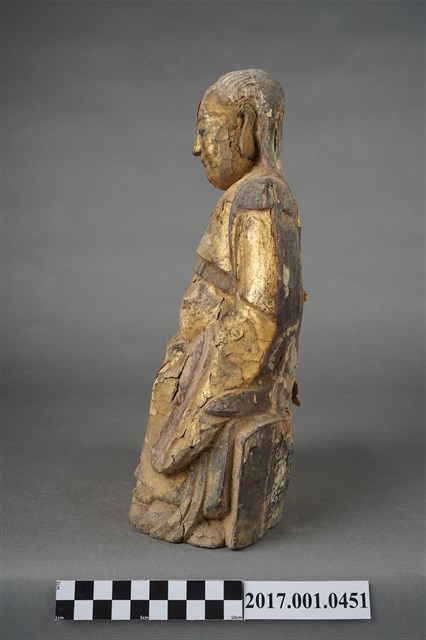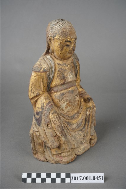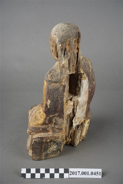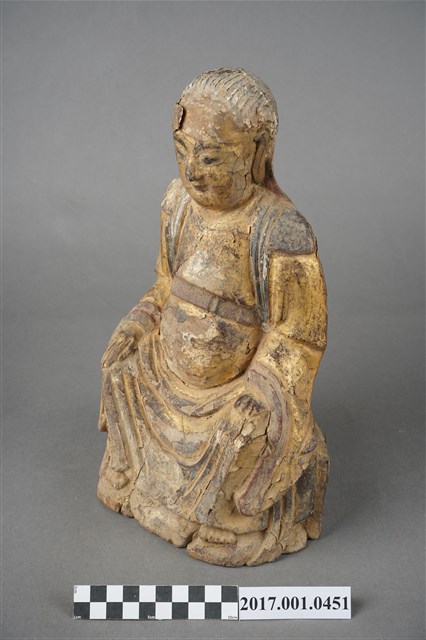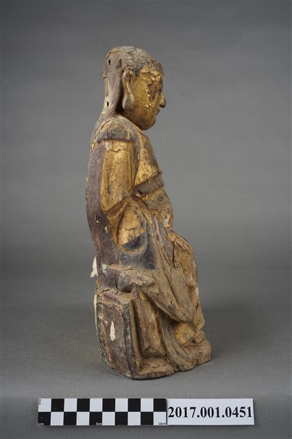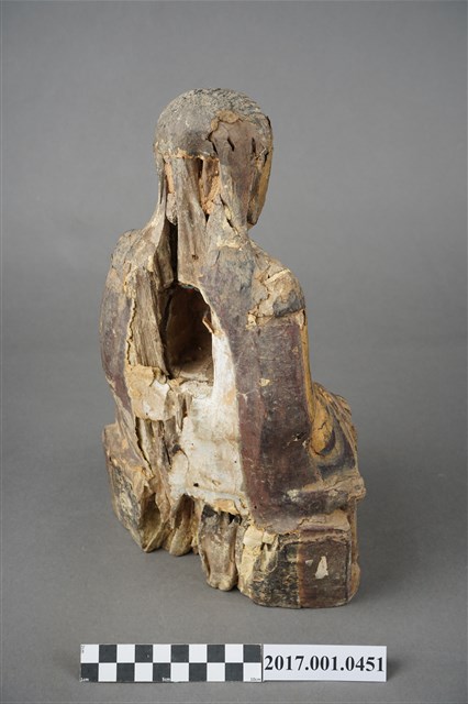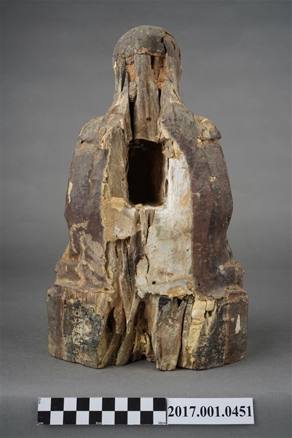 1.本件泥塑玄天上帝像,作坐姿姿態,端坐於臺座上,表面施作塗裝、安金不見紅粧佛技法,粧佛剝落嚴重,背面開有長方形入神洞,內部物件已取出。臉型輪廓橢圓,長耳、無鬚。披髮,身著盤領衣,披飄帶,肚腹圓凸,腰繫腰帶,胸前有看帶,跣足。挺身端坐,雙手扶於雙腿上,雙足自然垂下,臺座後端破損。本件雕造方式為身軀、臺座以木雕為主,頭部則以木條為枝幹,外加泥塑而成,作法特殊。
