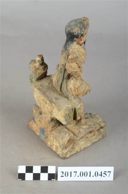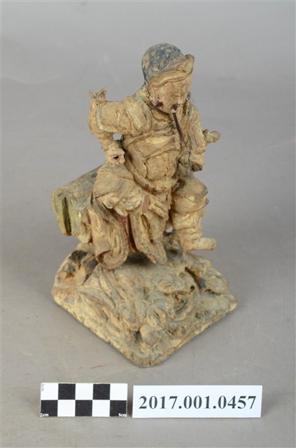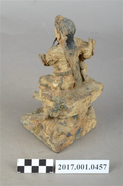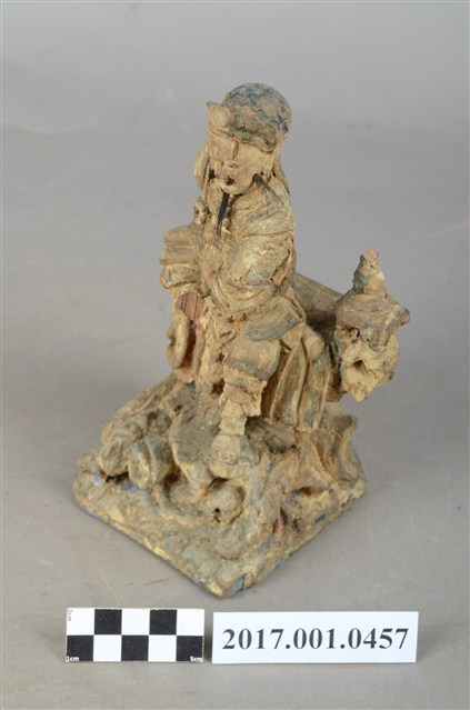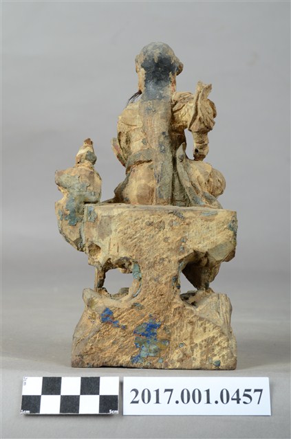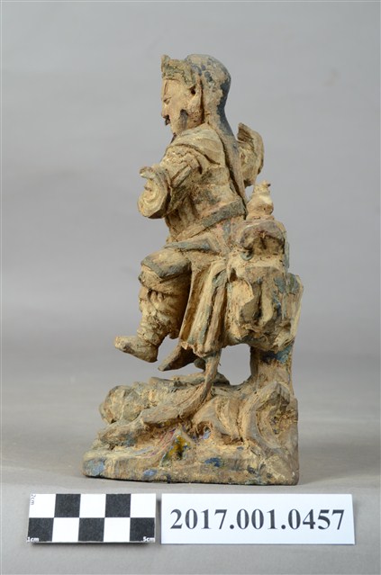 1.本件木雕玄天上帝像,作坐姿姿態,坐於岩座上,粧佛已褪去。臉型輪廓橢圓,顏面表現雙目半睜,鼻翼兩側、下顎、兩頰植黑鬚,嘴上植鬚斷裂。頭戴兜鍪,披髮,身著盤領衣,雙腳著長褲,肩頸披著披膊與護肩,腰束腰帶,護腹以腰帶固定,正面的腰帶下有前擋與左右擋鎧甲,跣足。挺身端坐,左手橫伸向右,左手掌斷裂遺失,右手曲肘握拳置於右腿上,持物遺失,雙手衣袖向後揚起。左腳自然垂下,右腳翹起,右腳削落遺失。臺座左側突出一短柱,上端置一只葫蘆,前方岩洞內隱約雕有龜蛇纏繞。