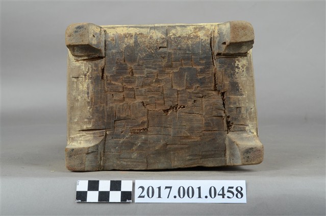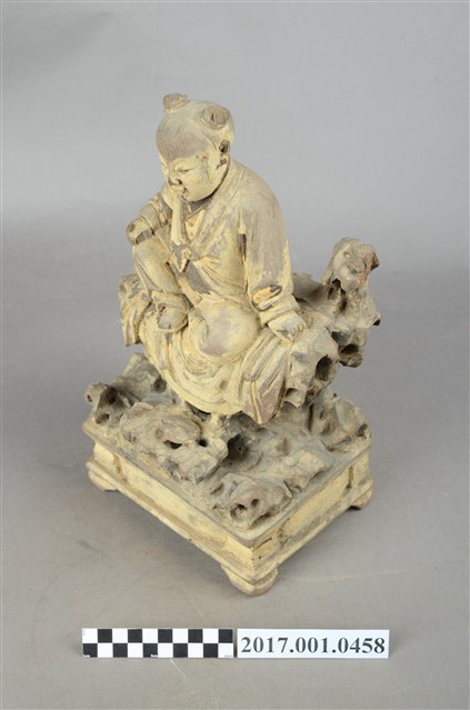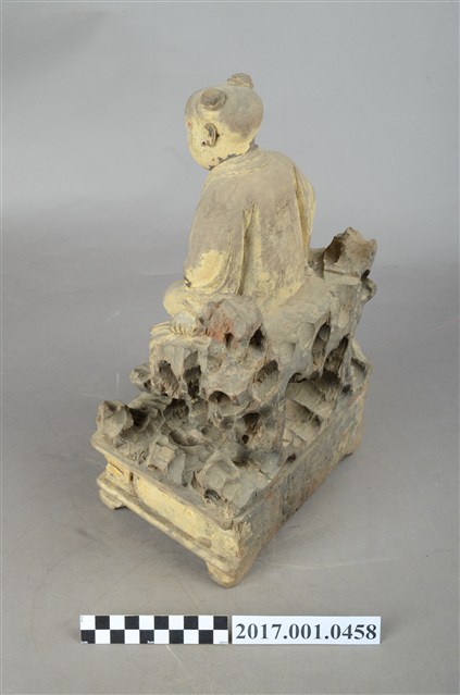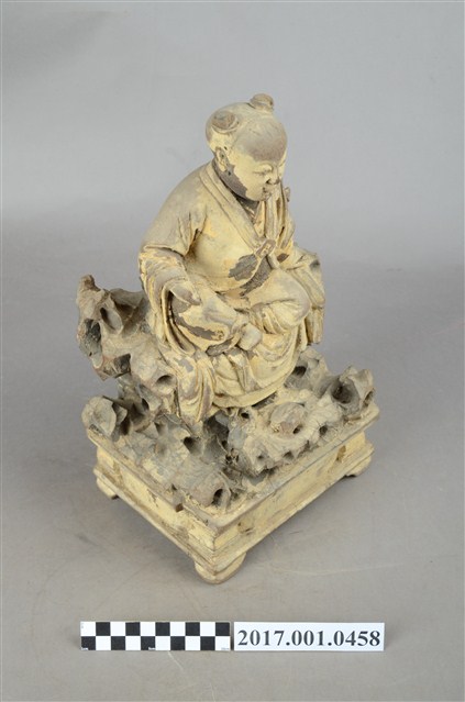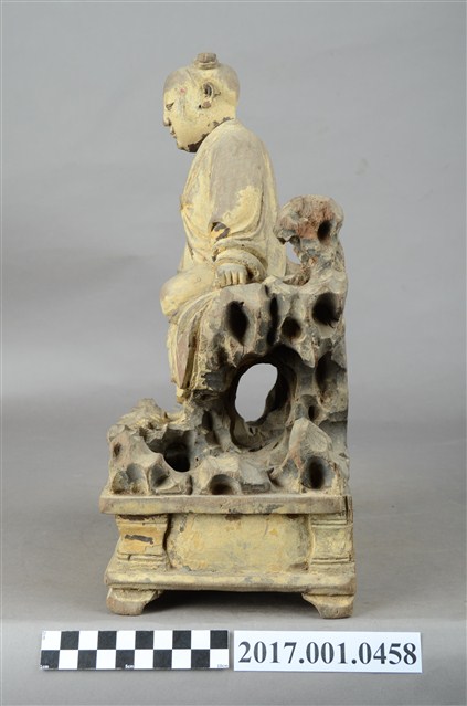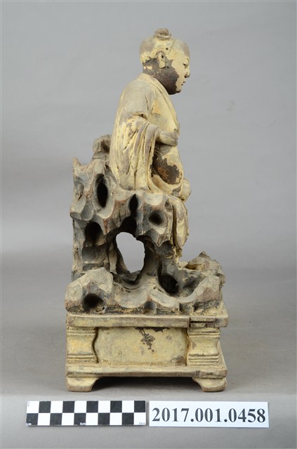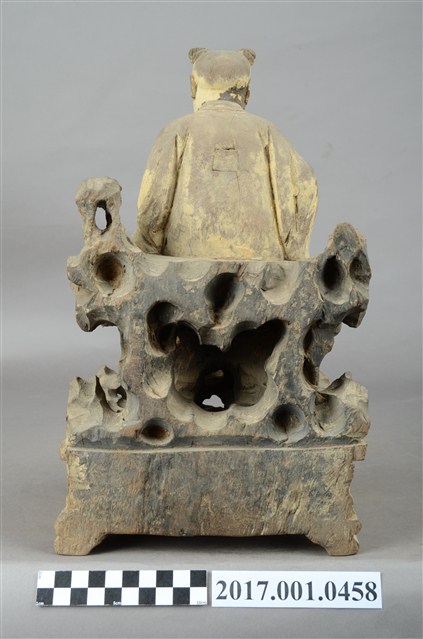 1.本件木雕玄天上帝像,作坐姿姿態,坐於岩座上,為修行造形,粧佛大多已褪去,僅存小部分粉線盤飾,背面開有方形入神洞,封榫尚存。臉型輪廓橢圓,顏面表現雙目半睜,鼻翼兩側、下顎、兩頰有植鬚孔,鬍鬚脫落。頭頂梳雙髻,內著斜襟長袍,外著開襟罩衫,開襟罩衫上有靈芝紋釦,腳穿履。左手向下支撐於岩座上,右手掌心朝上置於右膝上,手指缺損上。右腿屈膝,膝蓋朝右上方,左腿屈膝平坐,足部隱於右腿後。岩座分作上下兩層,上層作太湖石造形,座前有龜,頭部削落。臺座呈作束腰方几,四角作節鞭造形。
