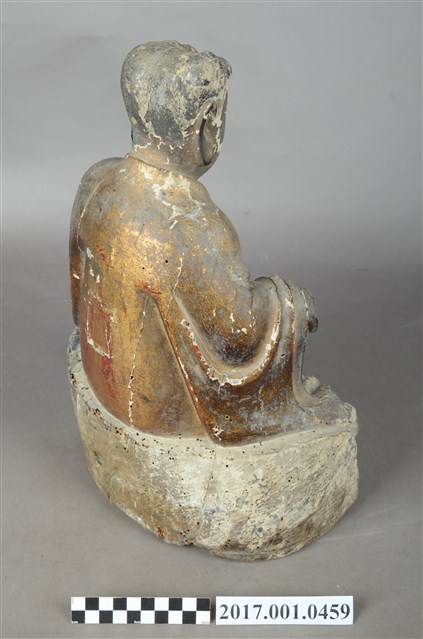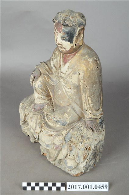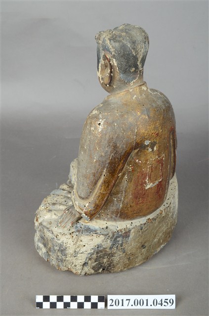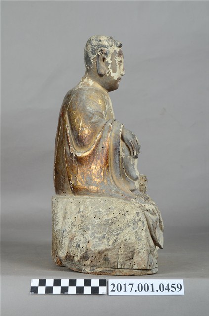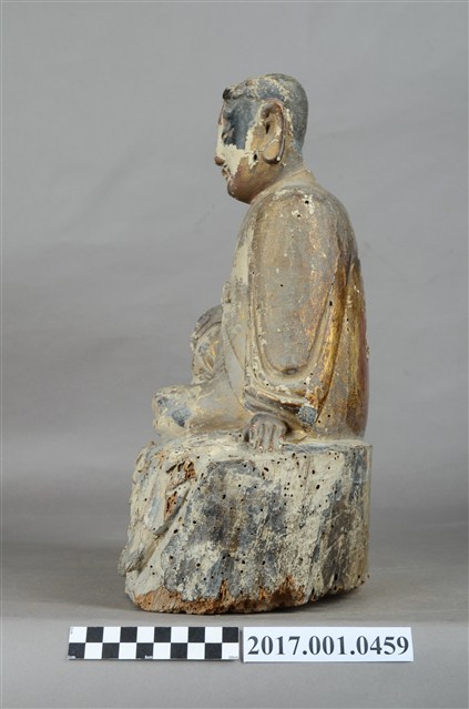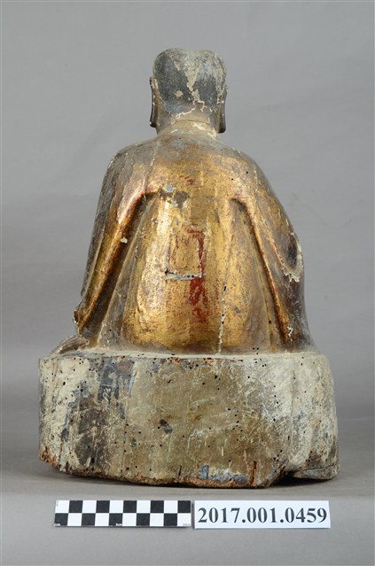 1.本件木雕玄天上帝像,採坐姿姿態,坐於岩座上,為修行造形,正面的粧佛已除去,正面分佈蛀洞,背面的安金與顏面的漆面尚存。臉型輪廓橢圓,顏面表現雙目半睜,鼻翼兩側、下顎、兩頰有植鬚孔,鬍鬚脫落。頭頂梳雙髻,內著斜襟長袍,外著開襟罩衫,開襟罩衫上有靈芝紋釦,跣足。左手向下支撐於岩座上,右手掌心朝下置於右膝上。右腿屈膝,左腿屈膝內伸平坐,足部隱於右腿後。岩座的座前有龜、蛇。