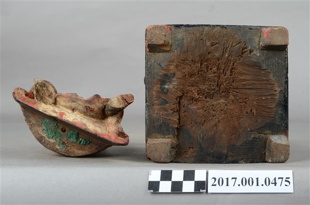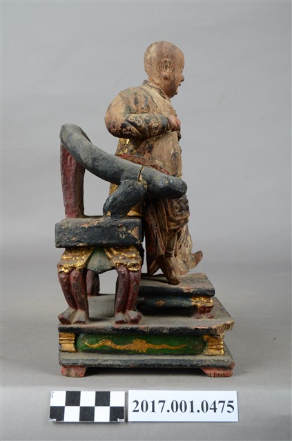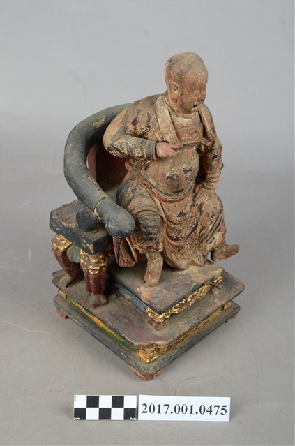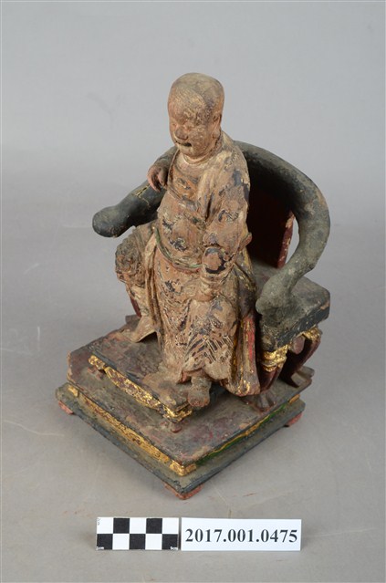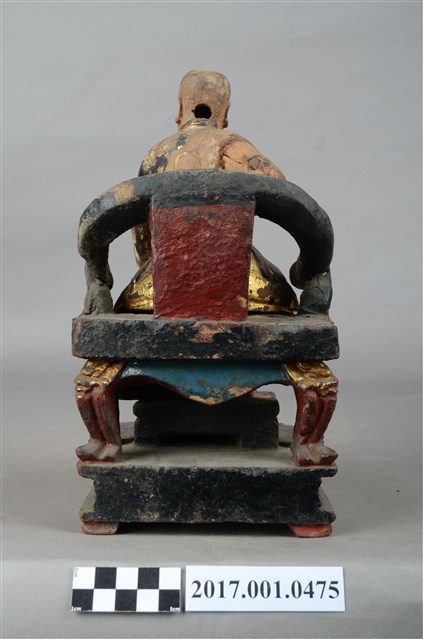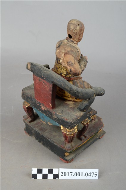 1.本件木雕田都元帥像採坐姿,端坐於圈背椅上,神像可脫離座椅,表面在雕刻後施以黑色為主之漆色,並局部以安金處理,漆面嚴重脫落,背部開有圓形入神洞,封榫尚存。元帥作青年男子相貌,張開大口,頭頂無冠亦無髮飾,頭部略轉向左方,腦後有一道圓孔與口部相通。身穿鎧甲,外罩窄袖長衫,腰間束腰帶,胸前有看帶,右膝露出護甲,作文武身造形,左手朝下手指朝內,支撐於左膝之上,右手小臂上舉,握胸上之看帶。左腿往左方前伸出,腳尖翹起,右腿內縮,墊起腳尖,作文武腳姿態。圈背椅下方連接方臺,臺之前方設有踏几,施以紅黑二色漆,局部安金裝飾,底部有挖鑿痕跡。
