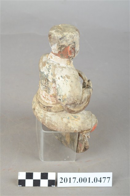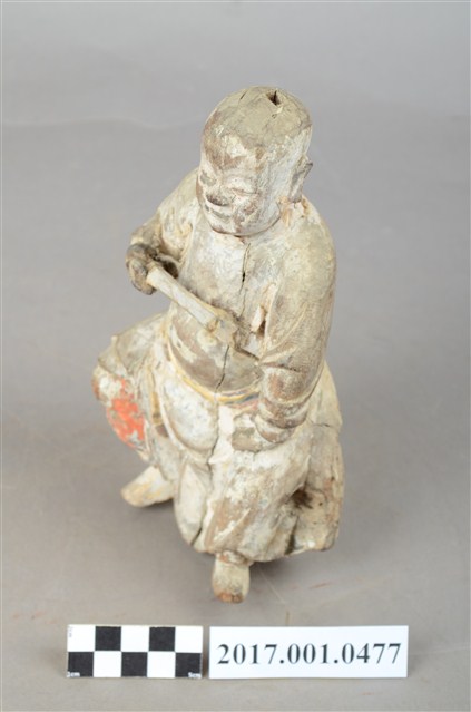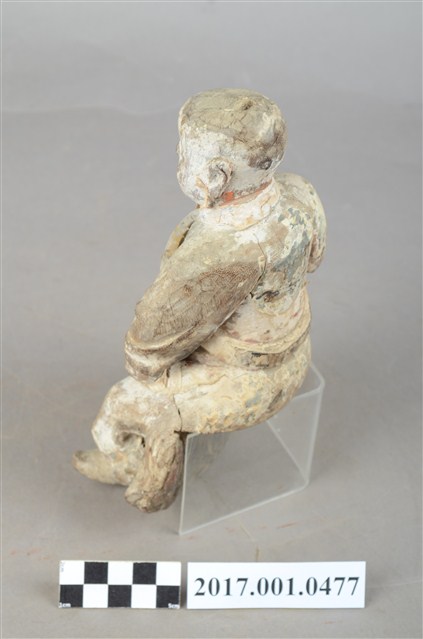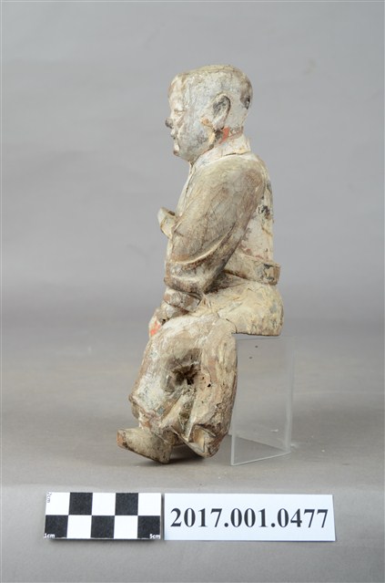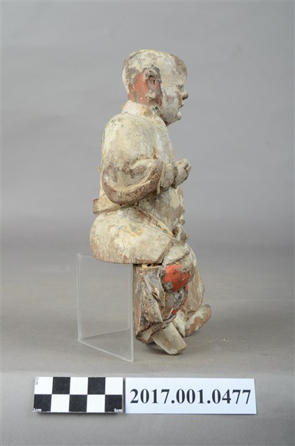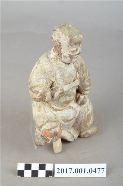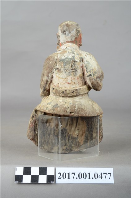 1.本件木雕田都元帥像採坐姿,座椅已失,表面粧佛大面積褪去,殘留左臂及臉部漆面,臉部薰黑,左足磨損,背部開有圓形入神洞,封榫尚存。元帥作年輕男子相貌,無冠,雙眼圓睜,大鼻長耳,嘴部微張,嘴角上揚帶笑意,頭部後上方鑿有兩個並列小孔,做為植髮辮處,髮辮已失,其下鐫刻兩束髮髻。身著圓領襯衣,外罩低胸窄袖長袍,腰間繫玉帶,胸前有看帶。左手下垂,手指朝內,支撐於左腿上,右手小臂上舉握看帶。雙足著皂靴,左足稍向外伸,右足內縮,作文武腳姿態。