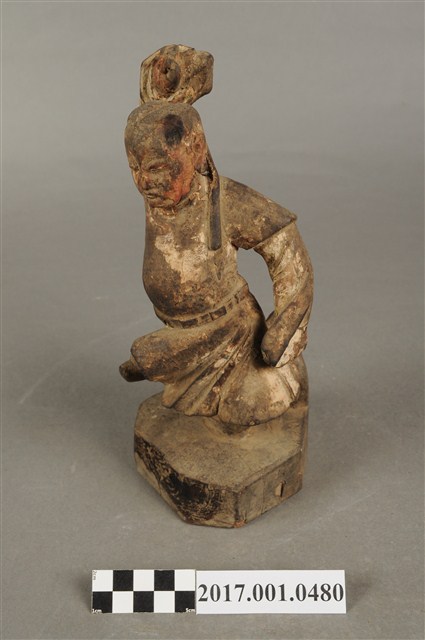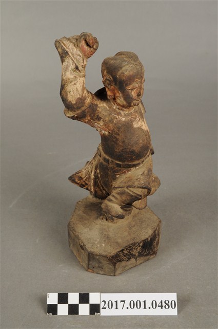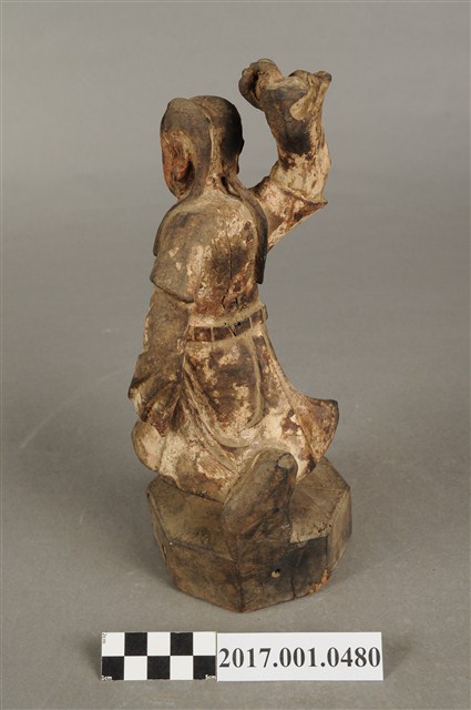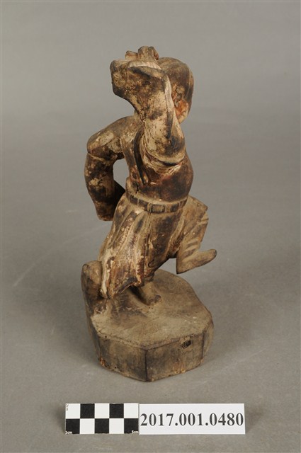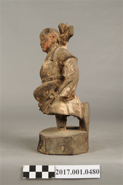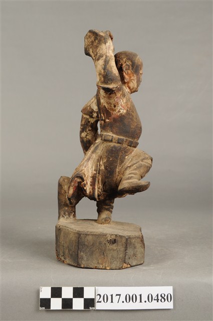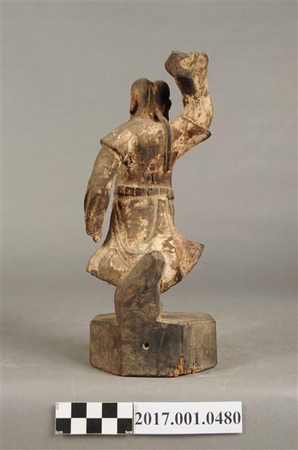 1.本件木雕田都元帥像採立姿,單腳站立於八邊形矮臺上,表面佈滿污漬,粧佛層局部剝落,鼻尖磨損。元帥作年輕男子相貌,絳紅色臉,無冠,雙眼圓睜,大鼻長耳,腦後雕有兩條髮辮,髮辮垂於背上。內著窄袖長衫,外罩圓領短袖袍,腰間束腰帶。左手下垂於身後,手掌作劍指訣,右手握拳向上高舉於腦後,掌心朝前。雙足著高筒靴,左腿向前翹起,右腿直立於臺座上,作金雞獨立姿態。