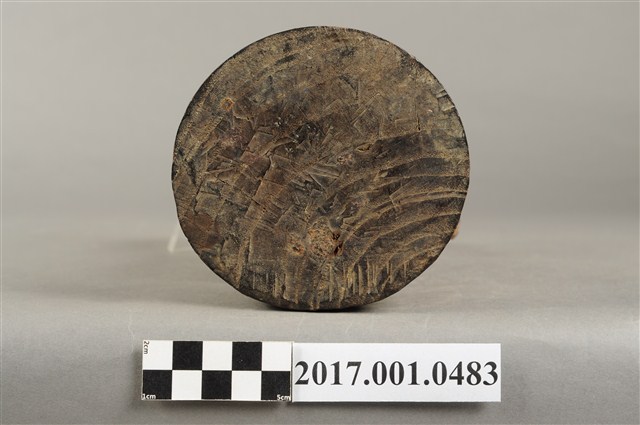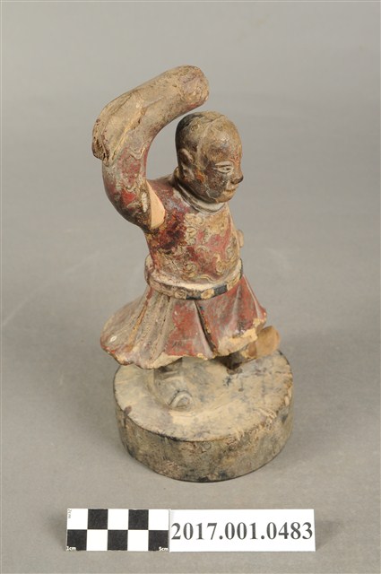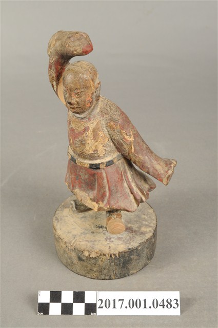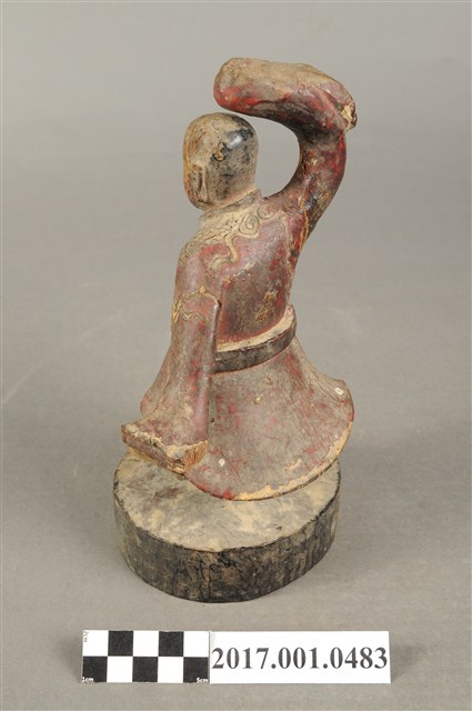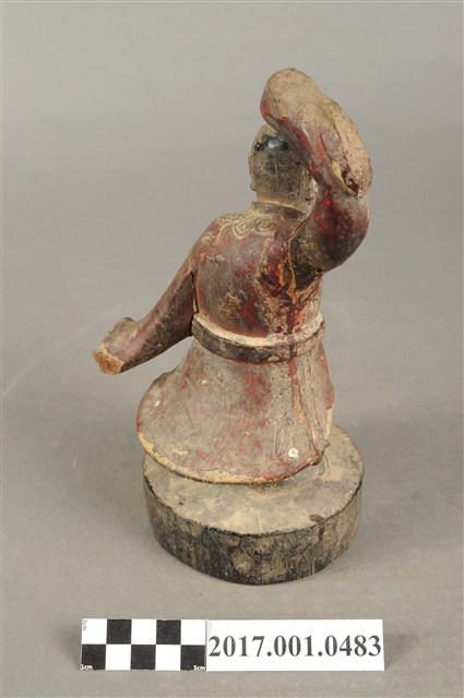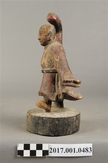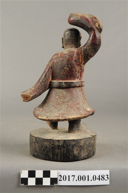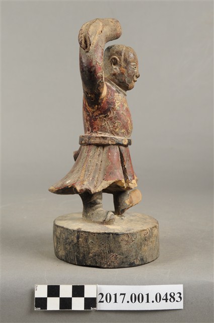 1.本件木雕田都元帥像採立姿,站立於圓形臺座上,表面粧佛局部剝落。元帥作年輕男子相貌,絳紅色臉,無冠,五官凸出,口部微張,腦後黑漆塗髮。身著長袖圓領絳紅官袍,腰間束腰帶,上身及兩袖作粉線雲紋裝飾。左手下垂伸向左後方,右手向上高舉於頭上,手掌隱於袖內。雙足著高筒靴,左足鞋尖翹起。