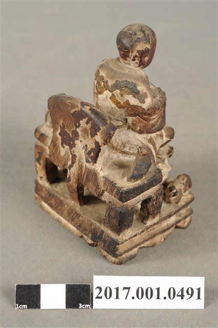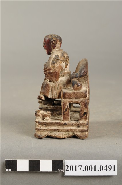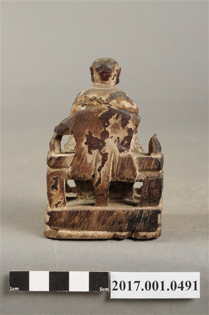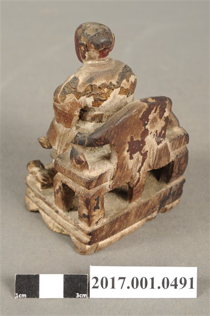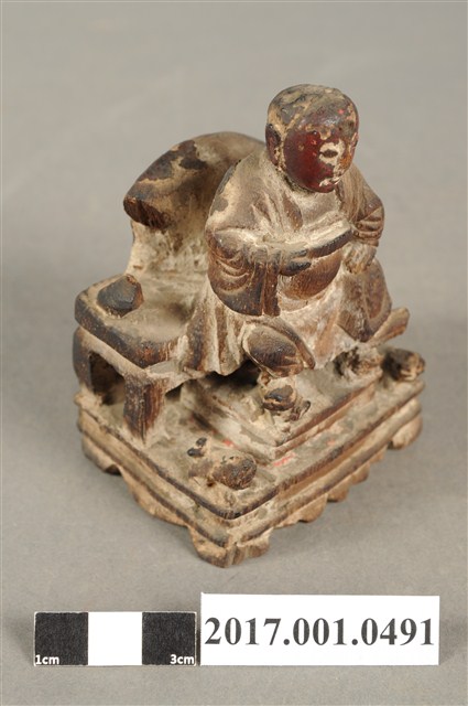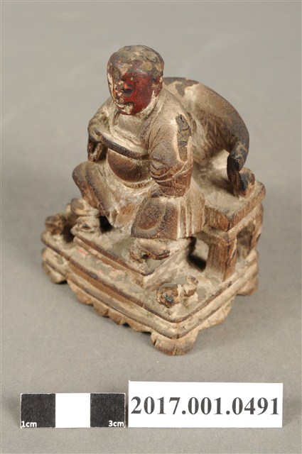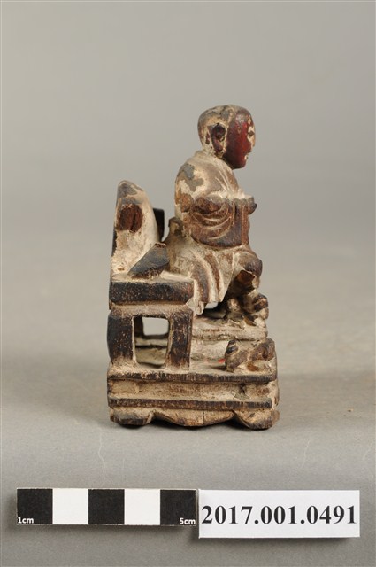 1.本件木雕田都元帥像採坐姿,端坐於圈背椅上,尺寸較小,表面粧佛大面積除去,臉部留有絳紅色漆面,鼻端破損,座椅兩側扶手斷裂缺損。元帥作年輕男子相貌,絳紅色臉,短髮,無冠。內著圓領襯衣,外罩低胸官袍,腰間繫腰帶,胸前有看帶。左手下垂,手指朝內支撐於左膝上,右手小臂上舉握看帶。雙足著皂靴,踏於座前踏几兩端的獅子背上,臺座作束腰方形臺,前方兩端之上又置一對獅子,下端作不規則邊。