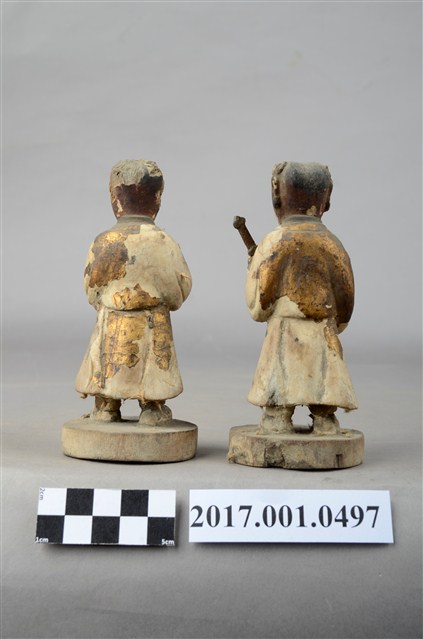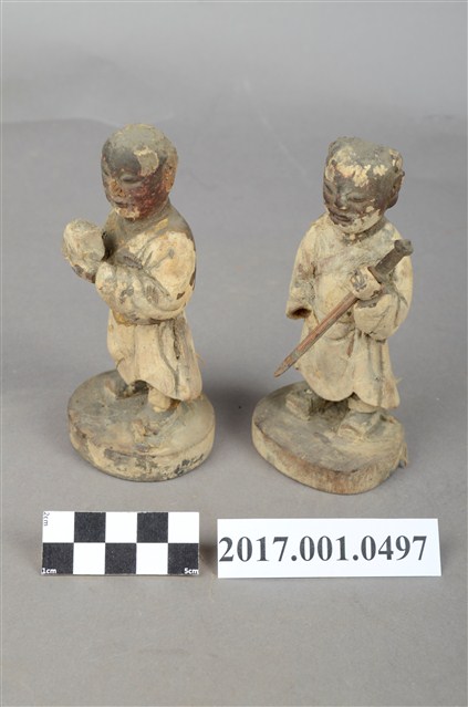 1.本組為木雕印童與劍童兩位成組配對,為主祀神的左右從祀。皆採立姿持物姿態,以木雕製作方式,站在一木臺座上,表面粧佛剝落嚴重。印童與劍童皆作童子相貌,髮梳雙髻,印童捧印盒,劍童持劍。 2.劍童與印童名稱取自手持物件,為帝后、王侯、將相之左右從祀神,以其手中持物象徵主神之職位。(富俐崴文化事業有限公司/謝宗榮計畫主持)