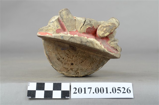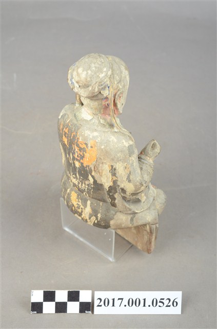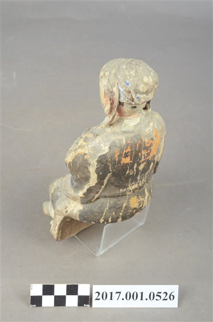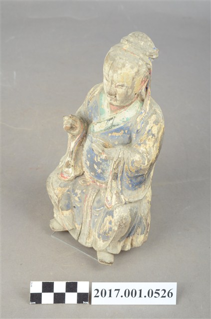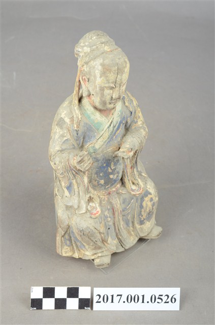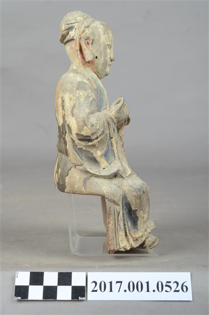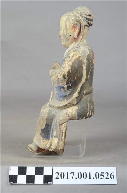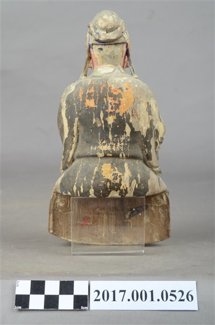 1.本件木雕孚佑帝君像,作坐姿姿態,表面施作塗裝粧佛技法,漆面剝落嚴重。臉型輪廓橢圓,雙目半睜,鼻翼兩側、下顎、兩頰旁皆有植鬚孔,鬍鬚已斷裂脫落。頭頂梳髮髻束巾,巾帶垂至兩肩上,身著右衽寬袖長衣,腰繫布帶。身驅前傾,雙足向下,左手橫伸向右,左手翻掌作托物狀,右手握拳持物,持物已失。本件屬於「脫椅」作法,臺座已失。