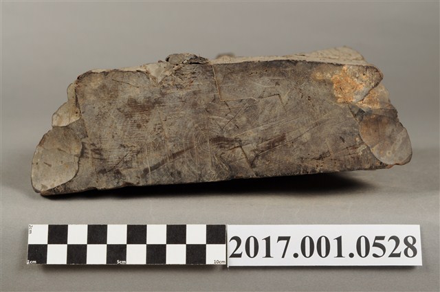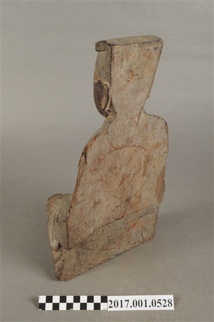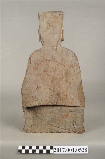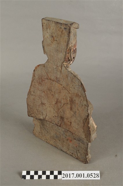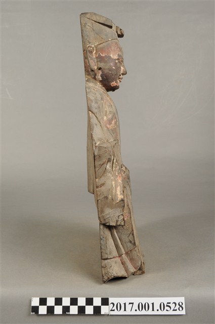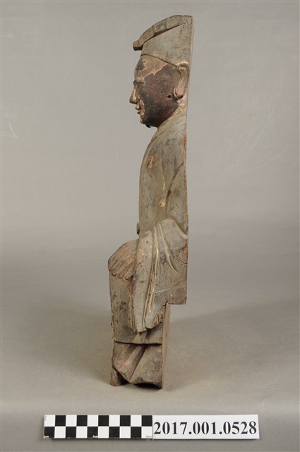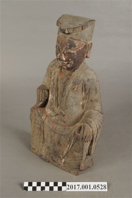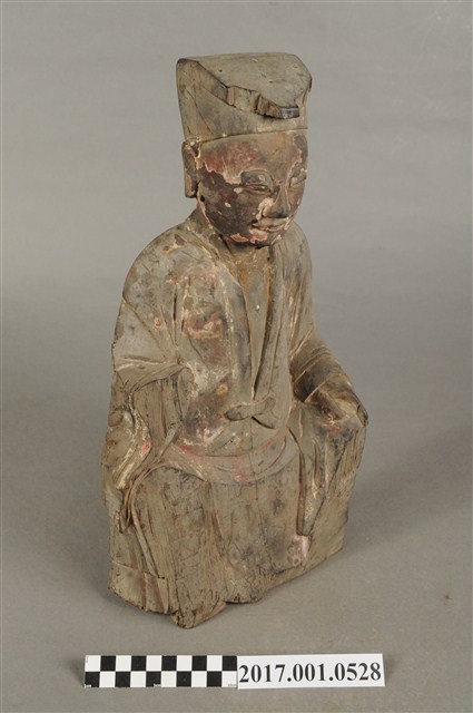 1.本件木雕孚佑帝君像採坐姿,為脫椅作法,臺座佚失,表面粧佛褪去,臉部殘留絳紅底色。嘴旁植鬚斷裂,巾之前簷破損,右手小臂、雙足前端大面積削去,背後自頭部以下削平整片。帝君作中年道人裝束,臉部薰黑,臉形圓潤,嘴角兩側上方、下頷鑿有植鬚小孔。頭戴純陽巾,此巾亦因帝君所戴,故名。身著斜襟長袍。左手扶於左膝處,右手小臂上舉削落,雙足平踏。