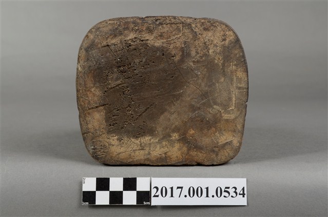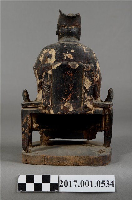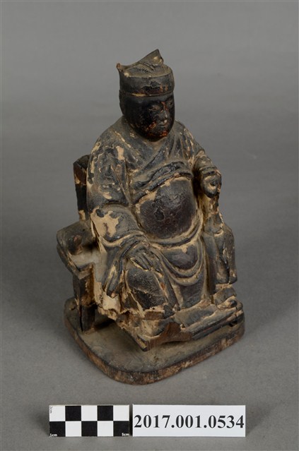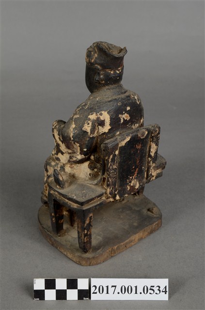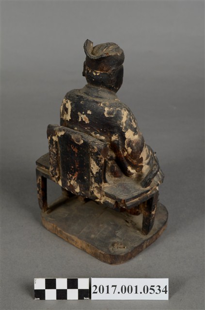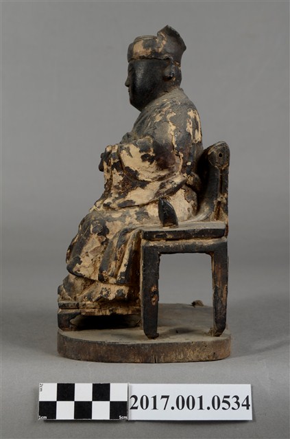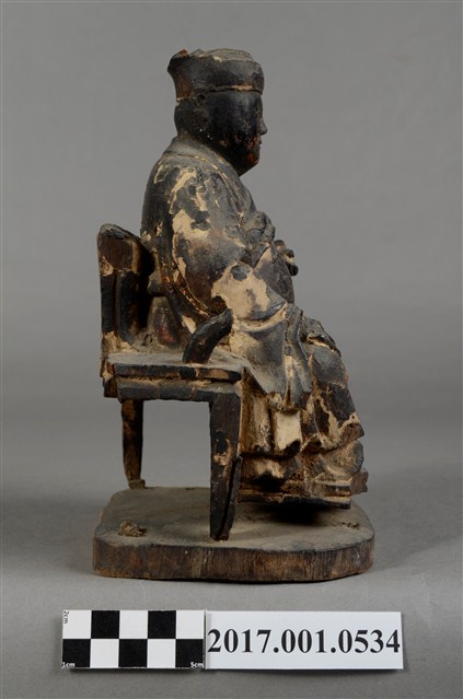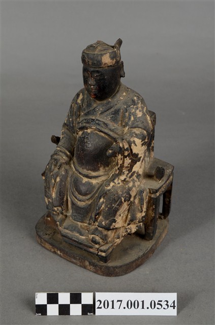 1.本件木雕灶君像,作坐姿姿態,表面施作塗裝粧佛技法,局部漆面剝落。臉型輪廓圓潤,雙眼半睜。頭戴忠靖冠,身著右衽寬袖衣,肚腹圓凸,腹下束腰帶,胸前有看帶,坐於圈背椅上。挺身端坐,雙足垂下,左手翻掌向上作托物狀,右手置於右腿,此坐姿手勢稱為「如意體」。圈背椅的椅背披著坐布,扶手已斷裂缺損,椅前有踏几,踏几缺損一角。