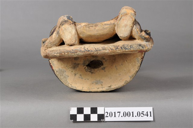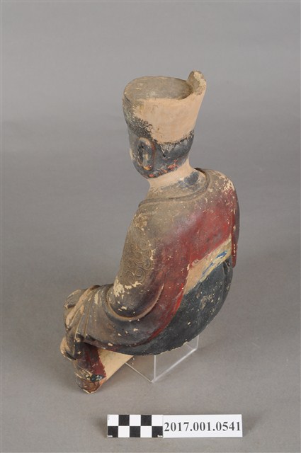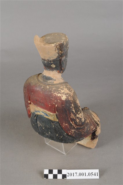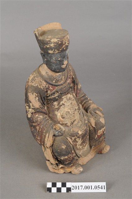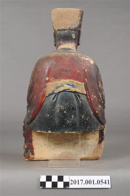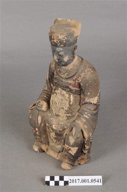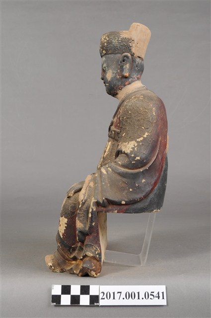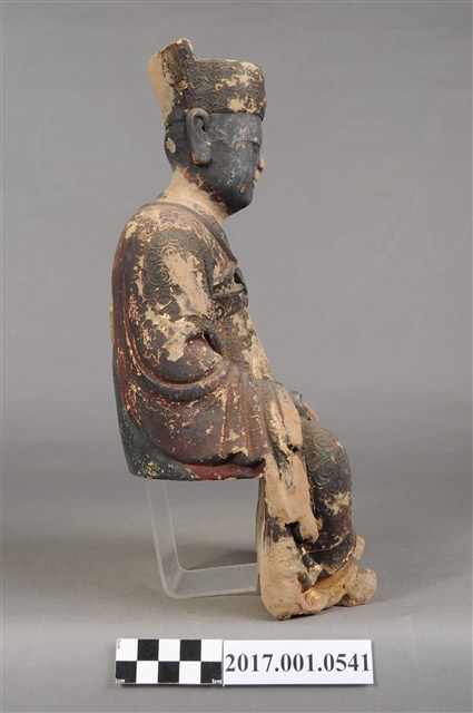 1.本件泥塑灶君像,作坐姿姿態,表面施作粉線盤飾粧佛技法,局部漆面剝落。臉型輪廓圓潤,雙眼半睜。頭戴忠靖冠,身著右衽寬袖衣,胸前束看帶,頸部佩戴金剛鎖。頭冠與袍服以粉線施作寶相花、蟒紋。挺身端坐,雙足垂下,右手翻掌向上作托物狀,左手置於左腿上,此坐姿、手勢稱為「如意體」。本件屬於「脫椅」作法,臺座已失。