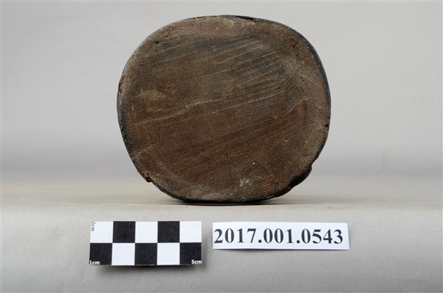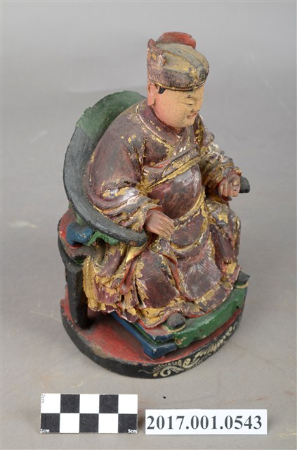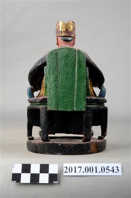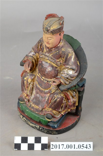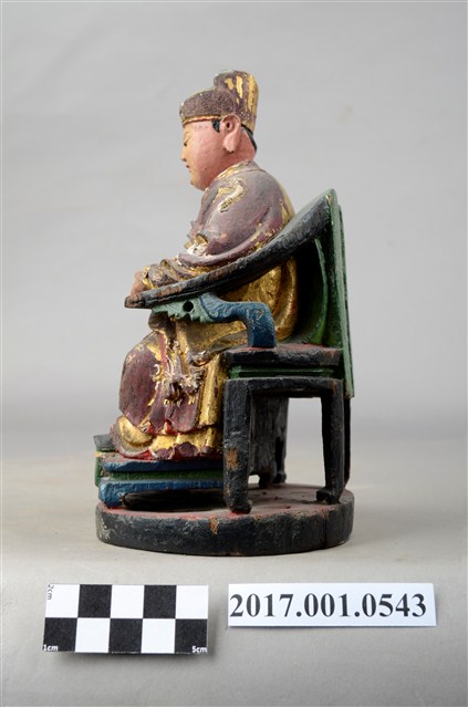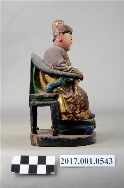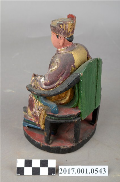 1.本件木雕灶君像,作坐姿姿態,表面粧佛剝落嚴重。臉型輪廓圓潤,雙眼半睜。頭戴三山冠,身著右衽寬袖衣,肚腹圓凸,腰束腰帶,胸下有看帶,坐於圈背椅上。挺身端坐,雙足垂下,左手翻掌向上作托物狀,右手掌倚著圈椅的扶手,此坐姿手勢稱為「如意體」,左手笏板已失。圈背椅的椅背披著坐布,椅前有踏几,椅下的臺座前下方白漆勾勒寶相花紋。