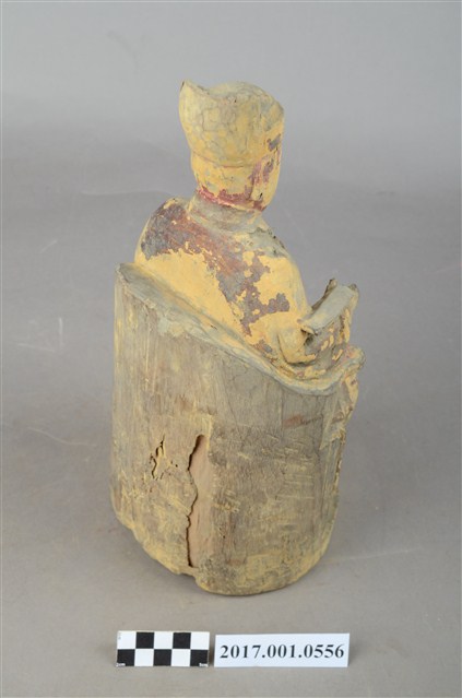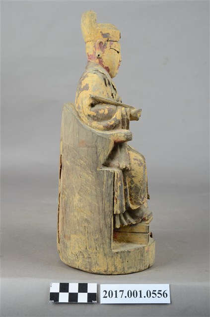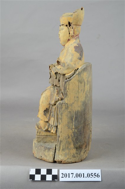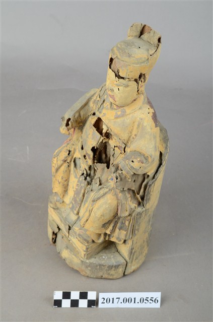 1.本件木雕灶君像,作坐姿姿態,坐於圈背椅上,表面粧佛已褪去,冠前方、胸前、左腹蛀蝕,左手賞缺損。臉型輪廓橢圓,雙眼半睜。頭戴忠靖冠,身著右衽寬袖衣,肚腹圓凸,腰束腰帶,身前有蔽膝。挺身端坐,雙足垂下,右手翻掌向上作托物狀,左手掌倚著圈椅的扶手,手掌皆已蛀蝕,此坐姿手勢稱為「如意體」。圈背椅的椅前有踏几。