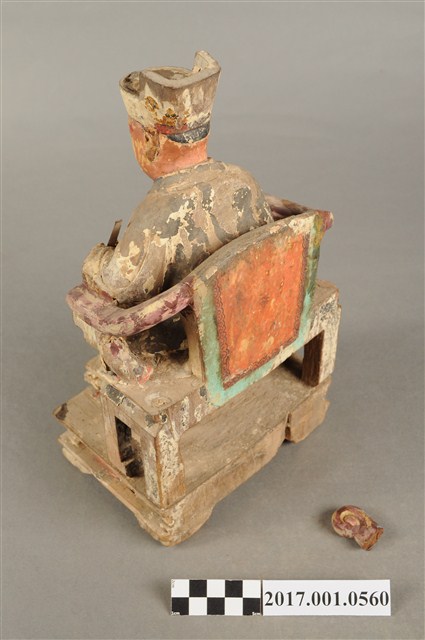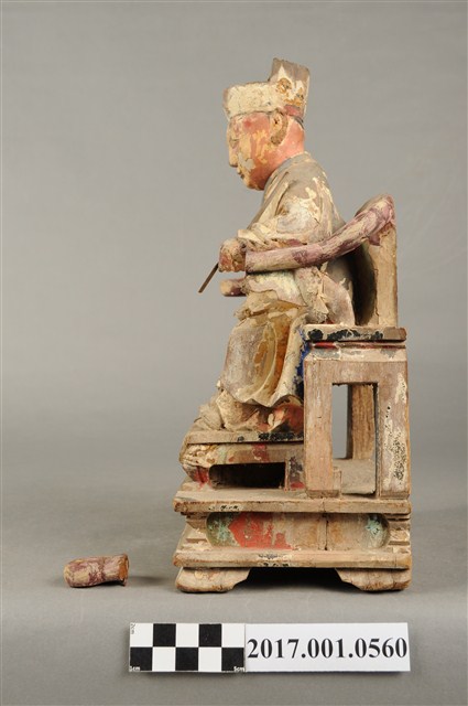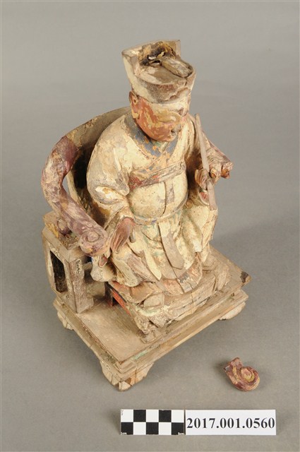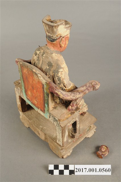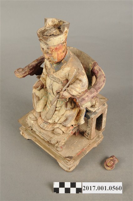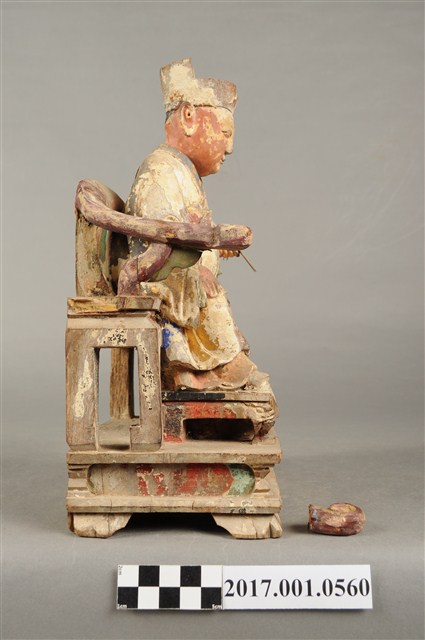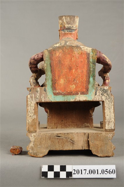 1.本件木雕灶君像,作坐姿姿態,坐於圈背椅上,表面粧佛大多褪去。臉色朱紅,臉型輪廓橢圓,雙眼半睜。頭戴忠靖冠,身著右衽寬袖衣,肚腹圓凸,腰束腰帶,胸前有看帶,腰下垂蔽膝。挺身端坐,雙足垂下,左手倚著圈椅的扶手,翻掌向上托著笏,笏以竹片製作,右手掌置於腿上,此坐姿手勢稱為「如意體」。圈背椅的椅背披坐布,椅前放置踏几,踏几披著踏布,椅下的臺座表現為案几形式。