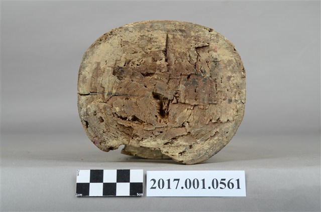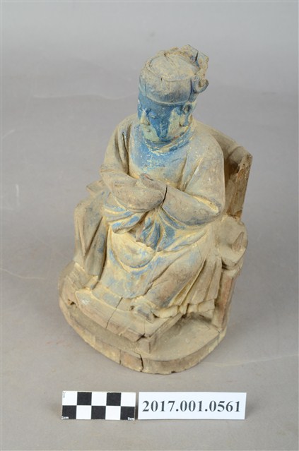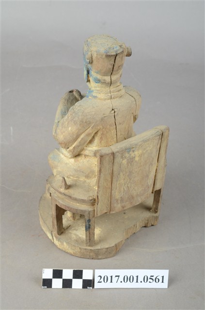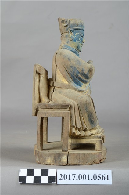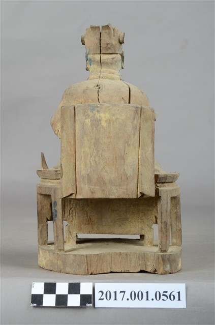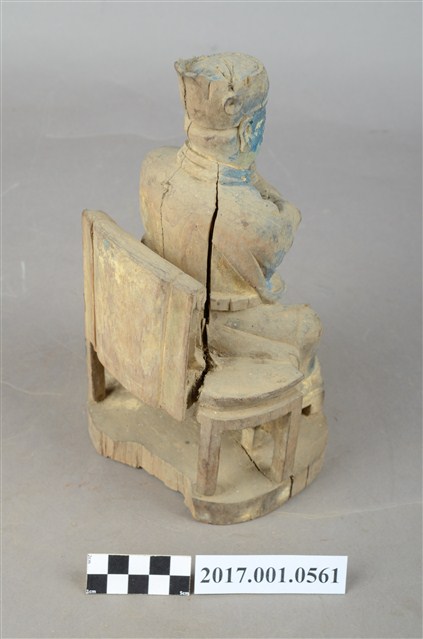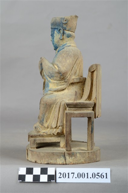 1.本件木雕灶君像採坐姿,灶君端坐於圈背椅上,表面粧佛已除去,顏面及袍服殘留有花青色料,圈背椅兩側扶手缺損,右後側一道縱裂紋自頸部延伸至座椅,臺座有蛀蝕孔,圓形臺座後端缺損。灶君作年輕男子相貌,面相圓潤,頭戴忠靖冠,身穿圓領寬袖袍服,腹部下方束腰帶。左手向內平舉,右手小臂上舉,兩手掌交疊作持物狀,手中朝板已失。雙腳踏於踏几上,左腿稍向內收。