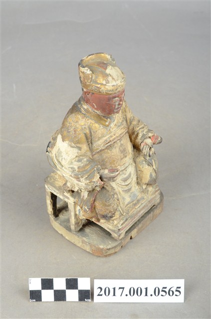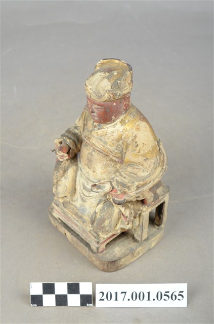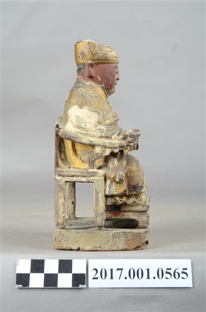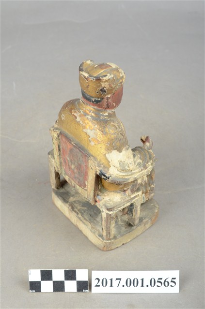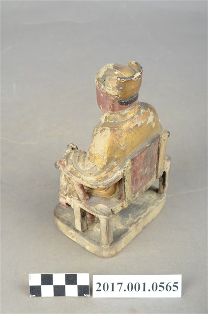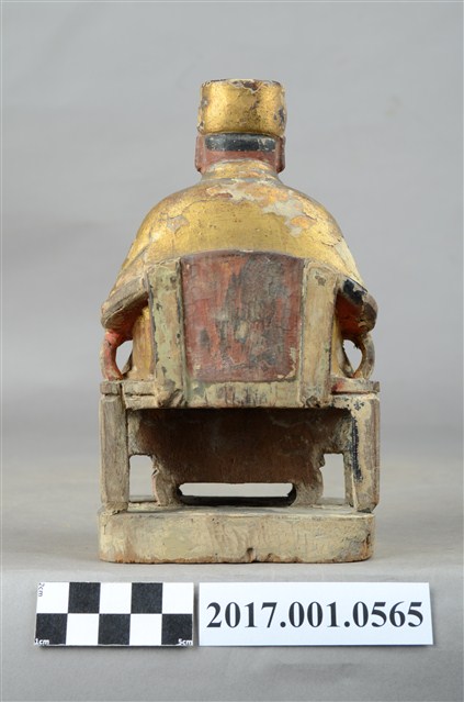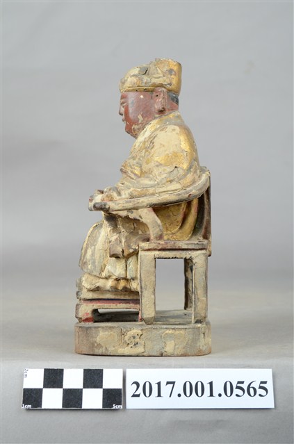 1.本件木雕灶君像,作坐姿姿態,表面施作塗裝、安金不見紅粧佛技法,腹部尚存些許粉雕,表面粧佛剝落嚴重。臉型輪廓圓潤,雙眼半睜。頭戴忠靖冠,身著右衽寬袖衣,肚腹圓凸,腹下束腰帶,胸前有看帶,坐於圈背椅上。挺身端坐,雙足垂下,雙手倚著圈背椅的扶手,左手翻掌向上作托物狀,此坐姿手勢稱為「如意體」。圈背椅的椅背披著坐布,椅前有踏几。