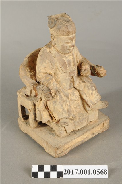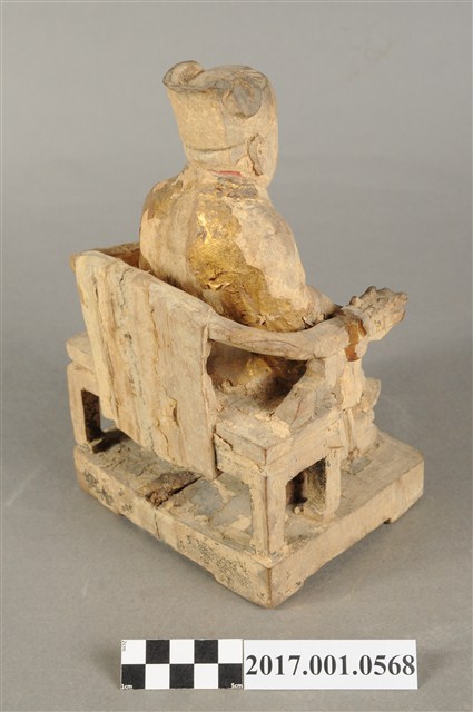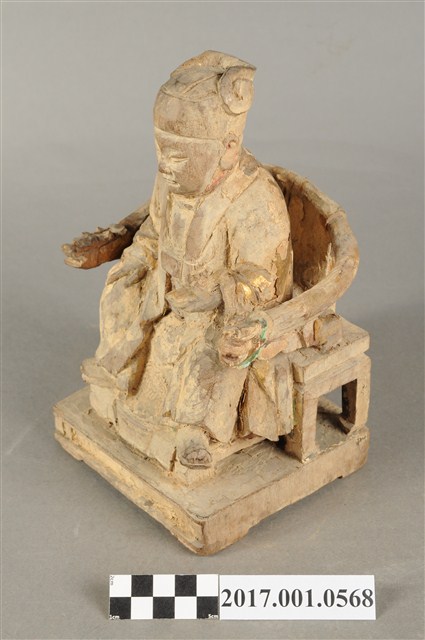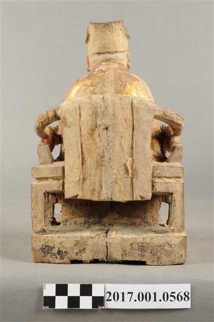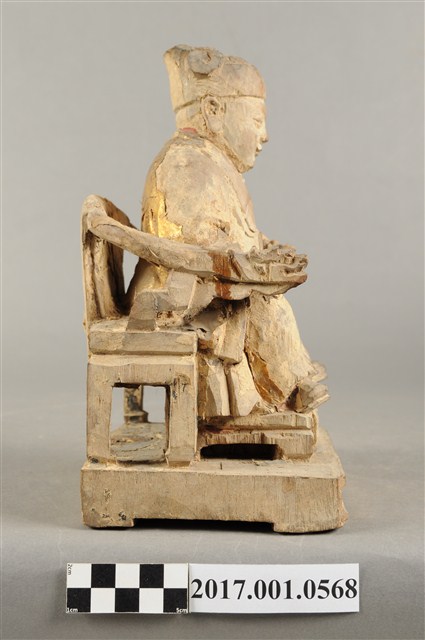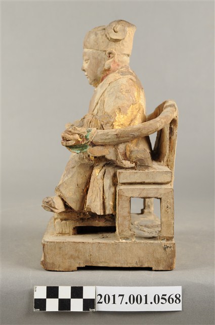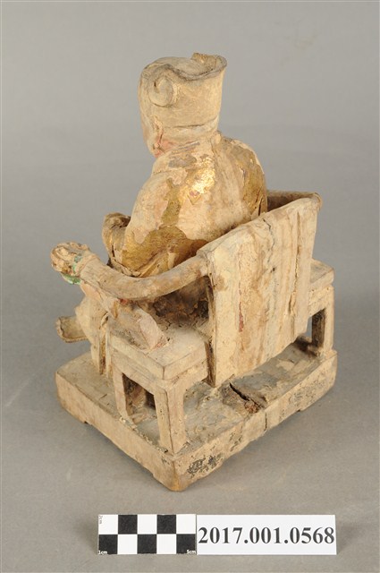 1.本件木雕灶君像採坐姿,雕工粗略,灶君坐於圈背椅上,表面粧佛已除去。灶君作年輕男子相貌,臉型圓潤,頭戴忠靖冠,身穿圓領袍服,外罩對襟罩衫。右手扶於右膝上,左手小臂朝前平舉,掌心朝上,握一只朝笏板,笏板上端磨損,雙腳踏於踏几上,足尖打開朝向外側,圈背椅扶手出頭處作龍頭雕飾。
