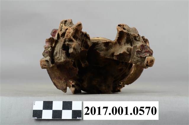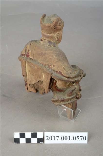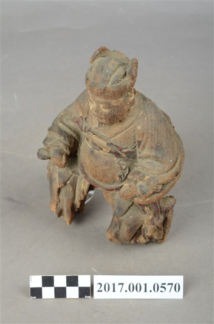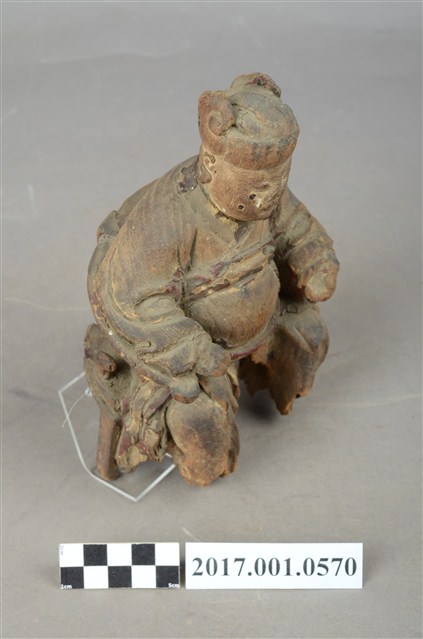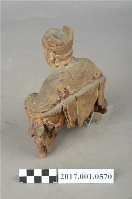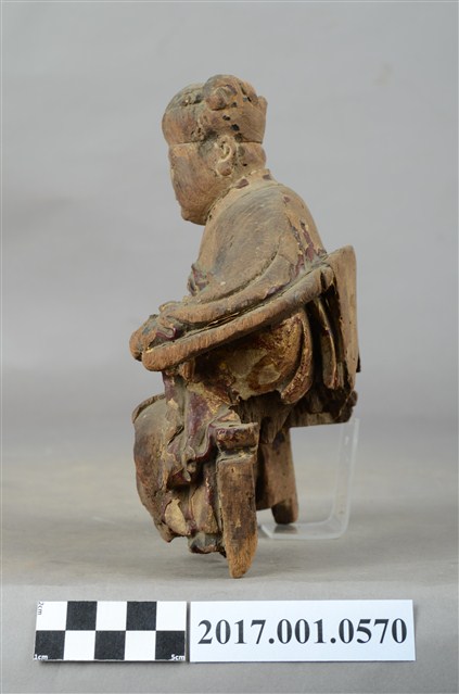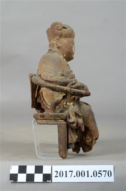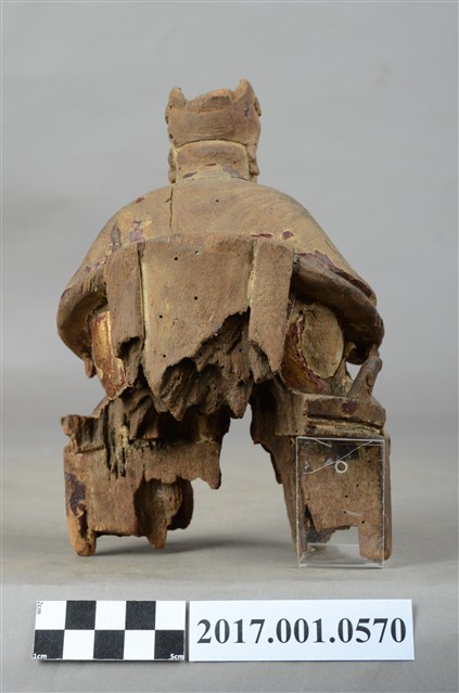 1.本件木雕灶君像,作坐姿姿態,坐於圈背椅上,表面粧佛已退去,下部蛀蝕嚴重。臉型輪廓圓潤,雙眼半睜。頭戴忠靖冠,身著右衽寬袖衣,肚腹圓凸,腹下束腰帶,胸前有看帶。挺身端坐,雙足垂下,雙手倚著圈背椅的扶手,左手翻掌向上作托物狀,此坐姿手勢稱為「如意體」。圈背椅的椅背披坐布,椅子的後兩足與臺座皆已蛀蝕。