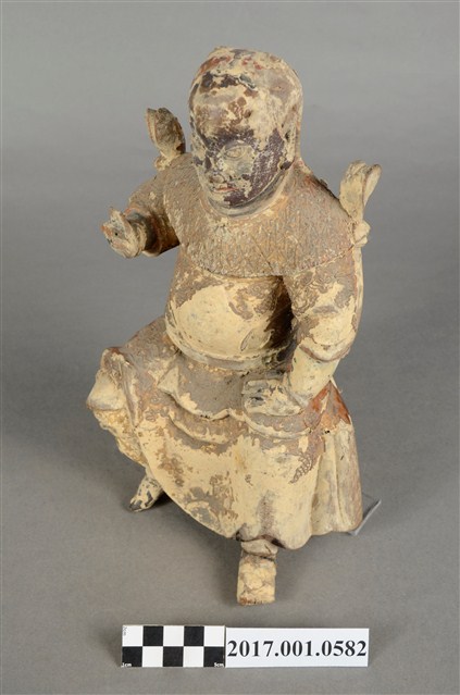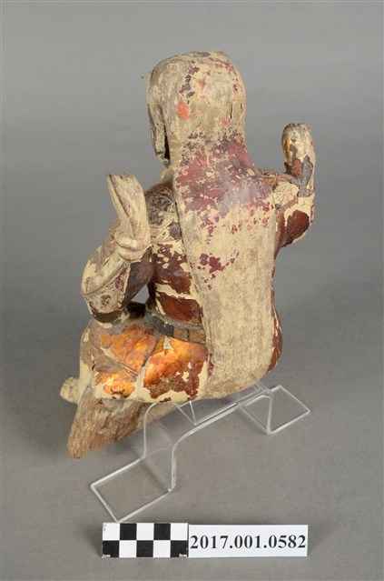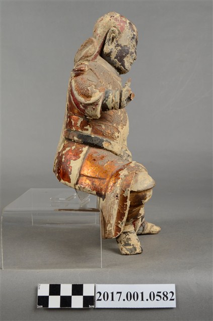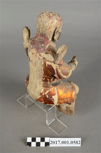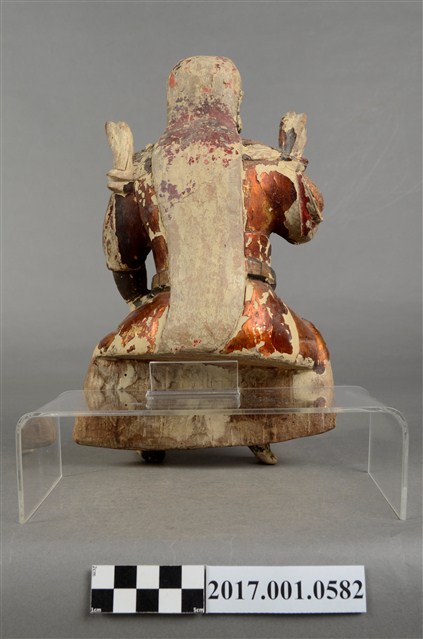 1.本件木雕法主公像,作坐姿姿態,表面粧佛施作塗裝、安金不見紅漆線盤飾粧佛技法,粧佛剝落嚴重。臉型輪廓橢圓,皺眉,雙眼瞠目,腦後雕刻披髮。身著袍服,披樹葉雲肩,腰繫腰帶,跣足。挺身端坐,雙足垂下,左腳向斜前方外推、右腳向內,作「文武腳」坐姿,左手手指朝內,支撐於左腿上,右手小臂向前平舉作劍指指訣,衣袖向後擺動上揚。本件屬於「脫椅」作法,臺座已失。