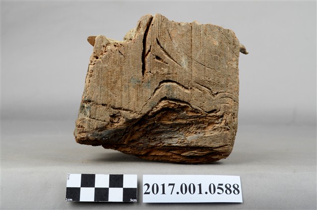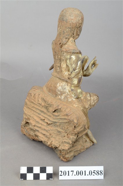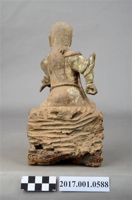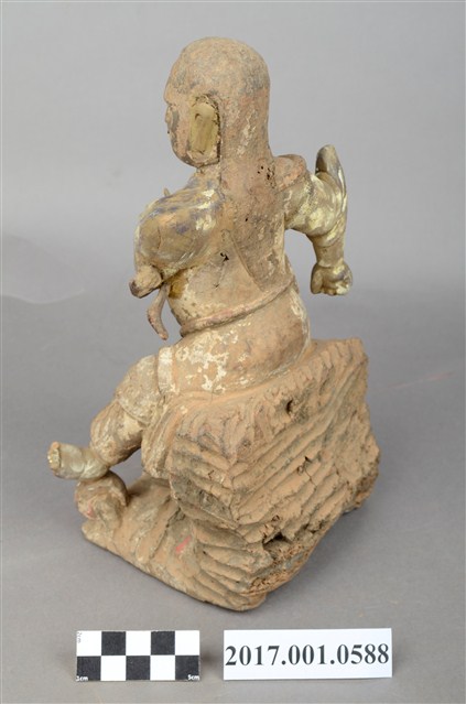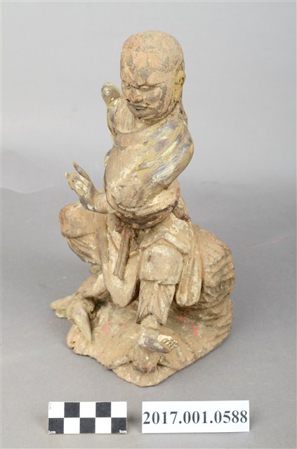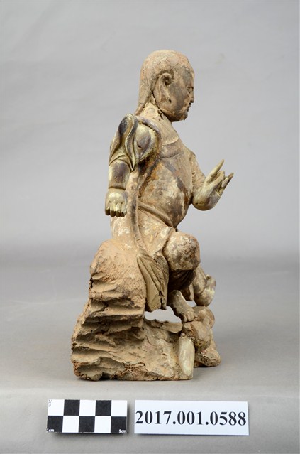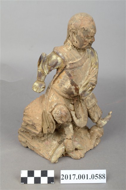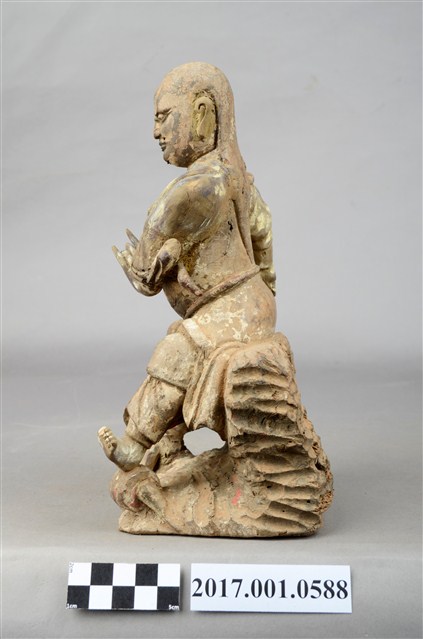 1.本件木雕法主公像,作坐姿姿態,表面施作塗裝粧佛技法,漆面剝落嚴重。臉型輪廓橢圓,皺眉,雙眼瞠目,鼻翼兩側、下顎、兩頰旁皆有植鬚孔,毛髮已斷裂遺失,腦後雕刻披髮。身著右衽寬袖衣,身披法索,腰繫布帶,跣足,坐於岩座上。挺身端坐,雙足垂下,左腳向斜前方外推、右腳向內,作「文武腳」坐姿,兩腳踏輪,左手橫伸向右,左手掌朝上,以拇指按中指與無名指,作道指訣,右手握拳持物向下,持物已失,衣袖向後擺動上揚。