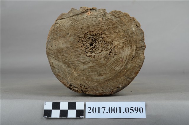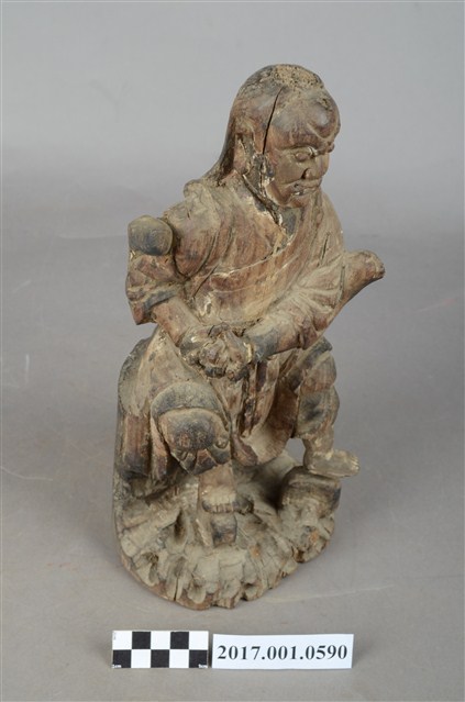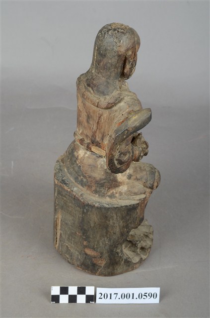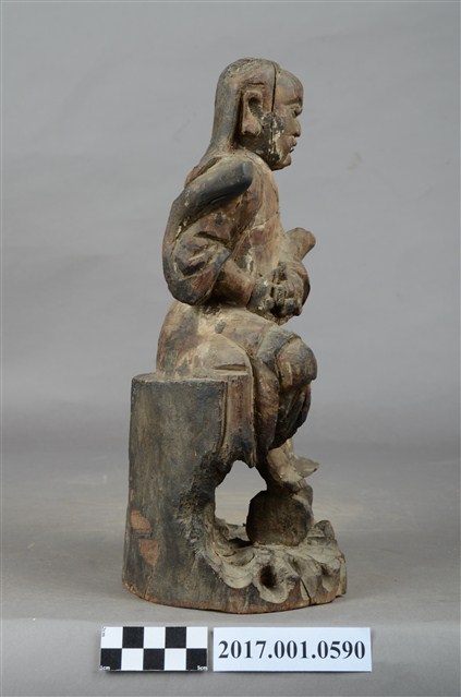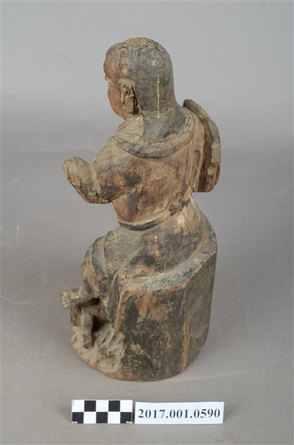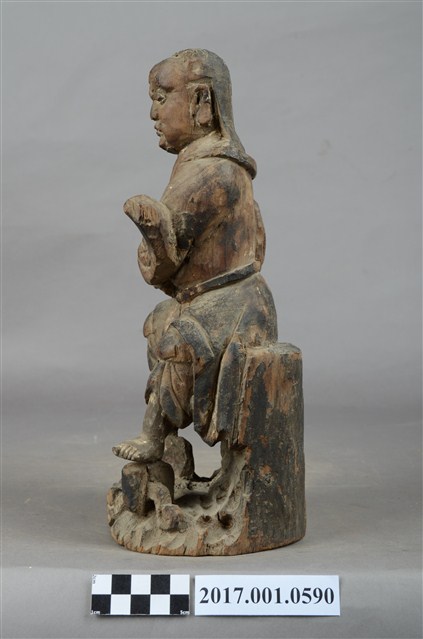 1.本件木雕法主公像,作坐姿姿態,坐於岩座上,表面粧佛已褪去。臉型輪廓橢圓,皺眉,雙眼瞠目,顱骨、顴骨與下顎凸出,鼻翼兩側、下顎、兩頰旁皆有植鬚孔,鬍鬚脫落,腦後雕刻披髮。身著右衽寬袖衣,腰繫布帶,跣足。挺身端坐,雙足垂下,左腳向斜前方外推、右腳向內,作「文武腳」坐姿,兩腳踏輪,雙手結手印置於右腹前,衣袖袖口向後上揚。