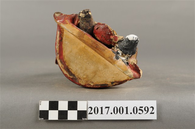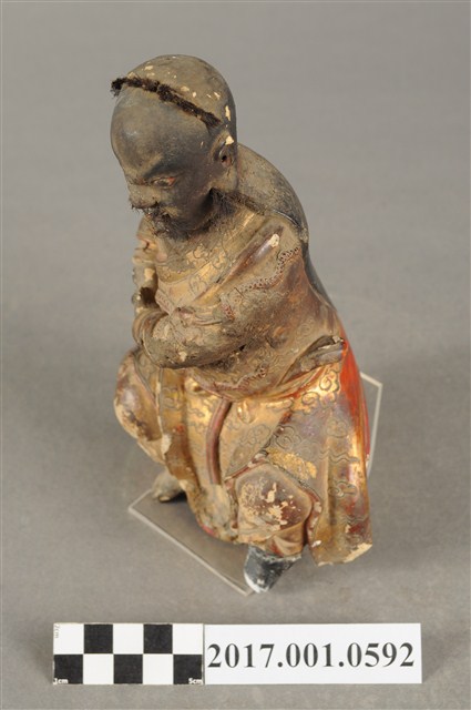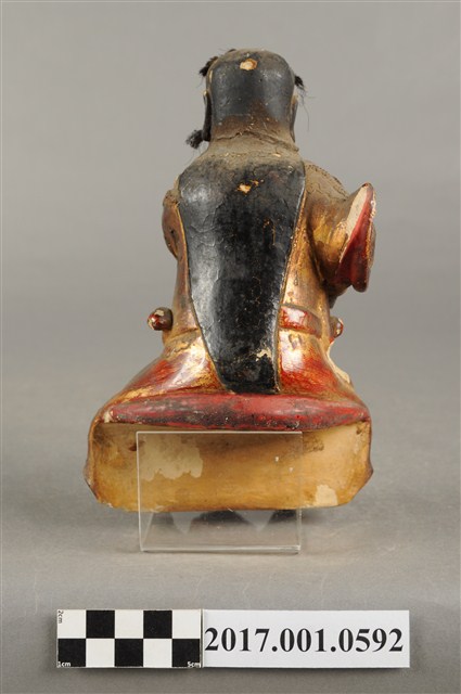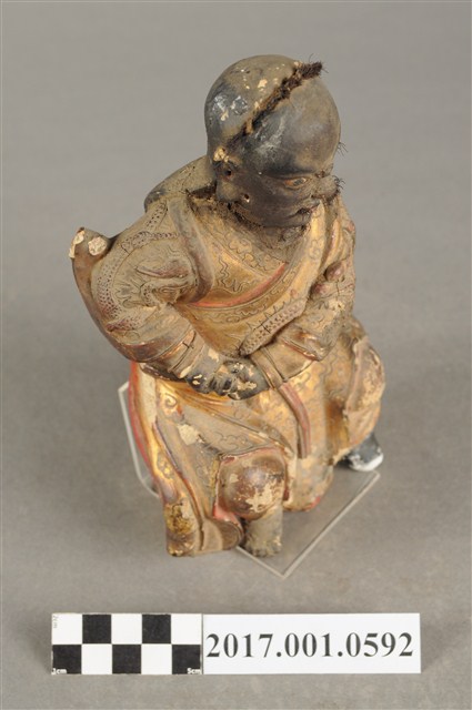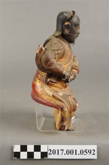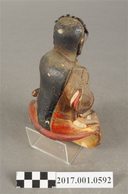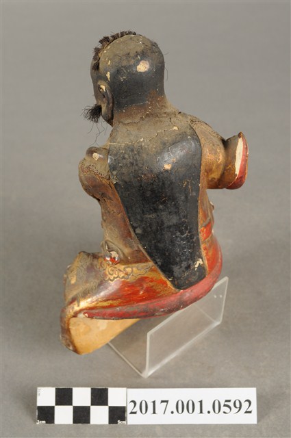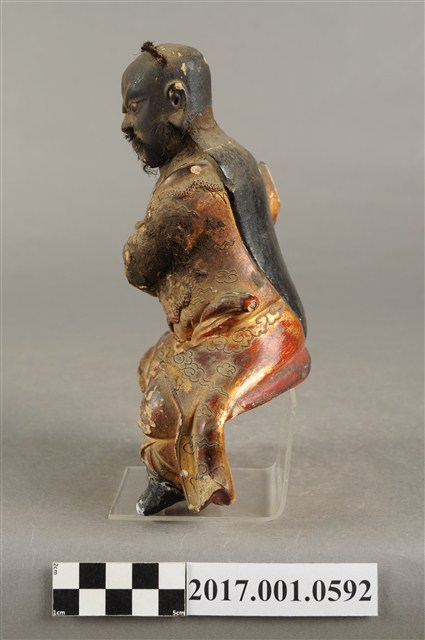 1.本件泥塑法主公像,作坐姿姿態,表面施作塗裝、安金不見紅粉線盤飾粧佛技法。臉型輪廓橢圓,皺眉,雙眼瞠目,顱骨、顴骨與下顎凸出。頭頂、鼻翼兩側、下顎、兩頰旁皆有植鬚孔,毛髮已斷裂遺失,腦後雕刻披髮。身著右衽窄袖衣,腰繫布帶,袍服以粉線盤飾蟒紋、雲紋。挺身端坐,雙足垂下,雙手結手印置於右腹前。本件屬於「脫椅」作法,臺座已失。