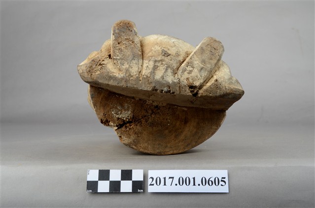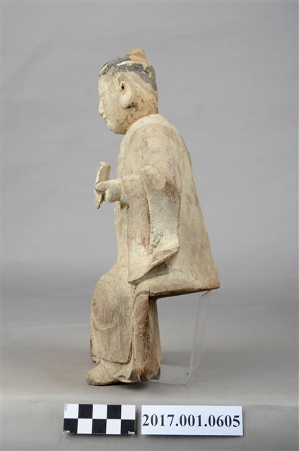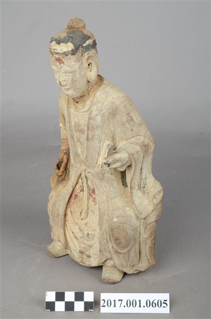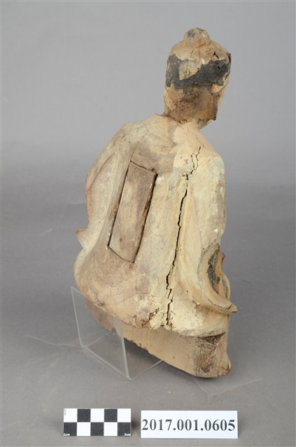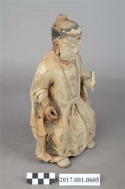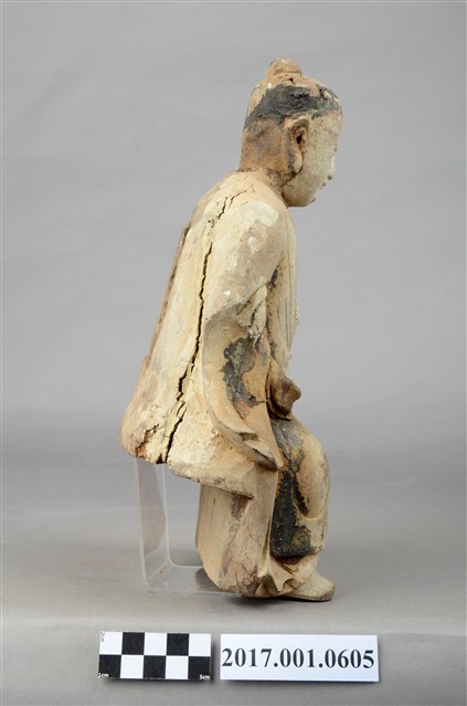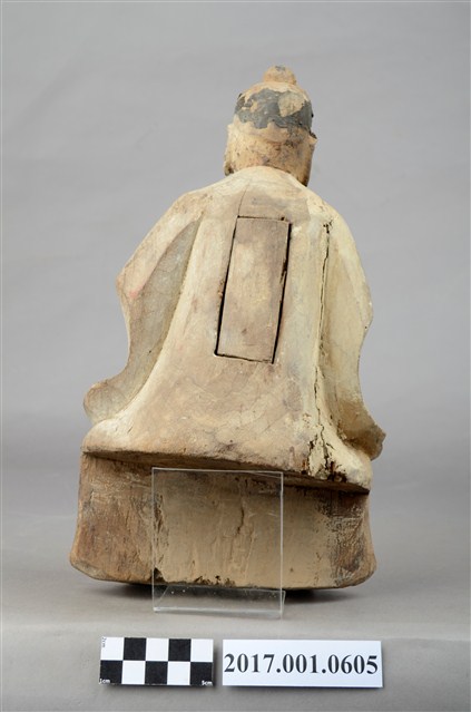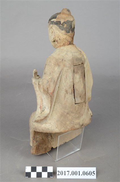 1.本件木雕法師像,採坐姿姿態,表面粧佛已除去,背面開有長方形入神洞,封榫尚存。法師像作男子相貌,臉形橢圓,頭頂梳髮髻,身著盤領衣,外罩開襟法袍,法袍在腹前綁結,腳穿鞋。挺身端坐,雙足垂下,左手向上持號令,右手握拳置於膝上。本件屬於「脫椅」作法,臺座已遺失。