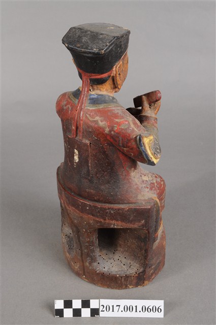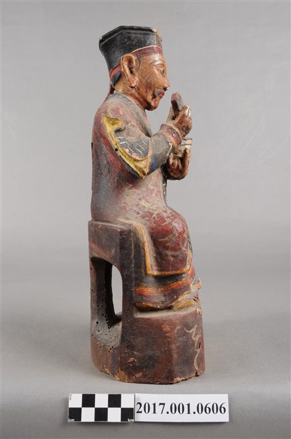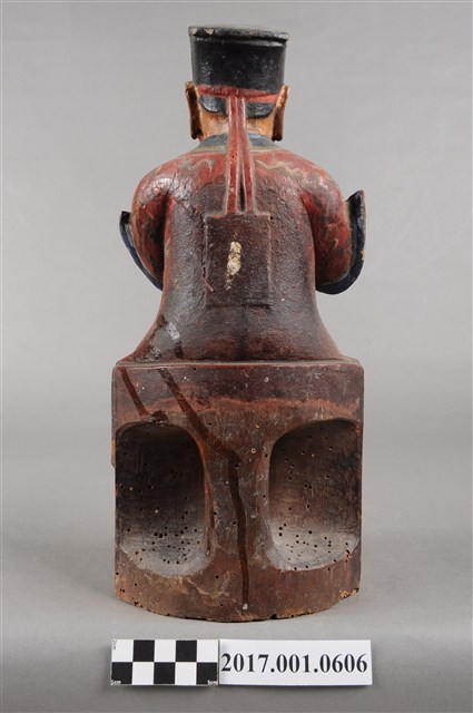 1.本件木雕法師像,表面施作塗裝粧佛技法,漆面保存完整,作坐姿姿態,背面開有方形入神洞,封榫尚存。顏面表現雙目張眼,墨線勾勒眉毛、鬍鬚,展現壯年男性面容。頭戴方巾並綁著紅帶,紅帶於腦後綁結,身著長袍,腰繫布帶,上半身在長袍外套著對襟的法袍,法袍在腹前綁結,腳穿履。端坐,左手捧淨水盂置於腹前,右手持號令於淨水盂上。臺座於座前白漆勾勒雲紋,臺座於背部有挖鑿出手把。