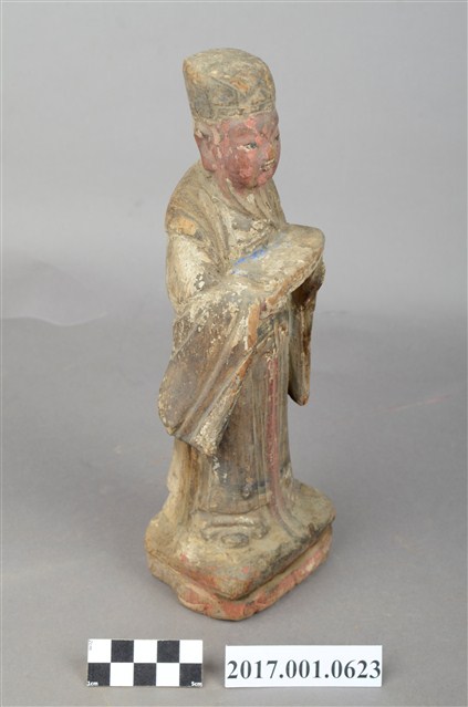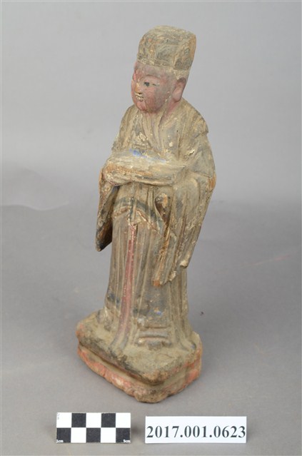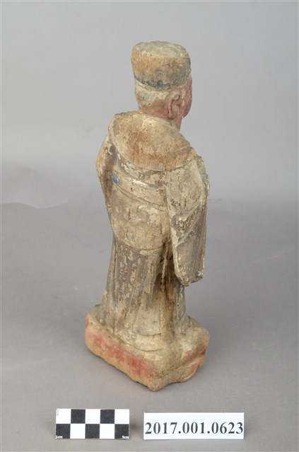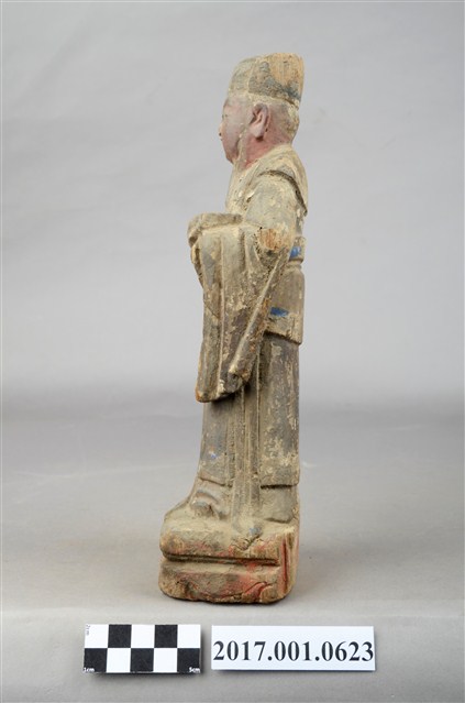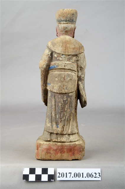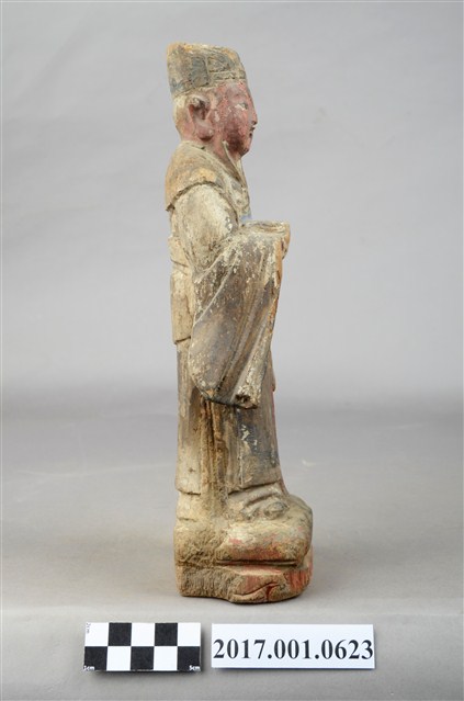 1.本件木雕周公像,作立姿姿態,表面粧佛剝落。頭部微側向右,雙目半睁,顏面蓄五柳長髯。頭戴梁冠,梁冠於正面的顏題處有雕刻裝飾,上半身著右衽寬袖衣,腰束腰帶,下半身圍著裳,裳前的緞帶垂至臺座,雙腳穿履。立像挺身以雙足併攏的姿態站於臺座上,雙手托著書冊。
