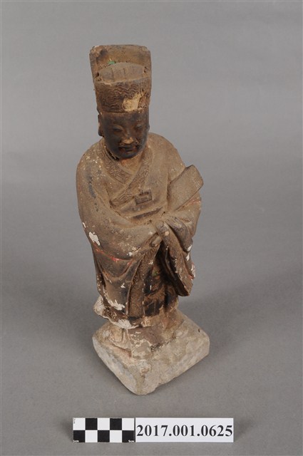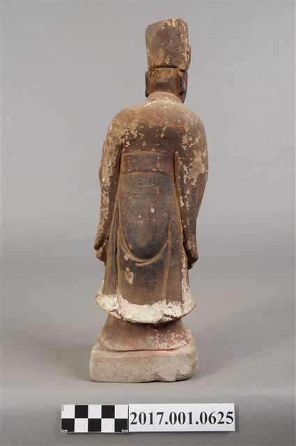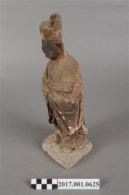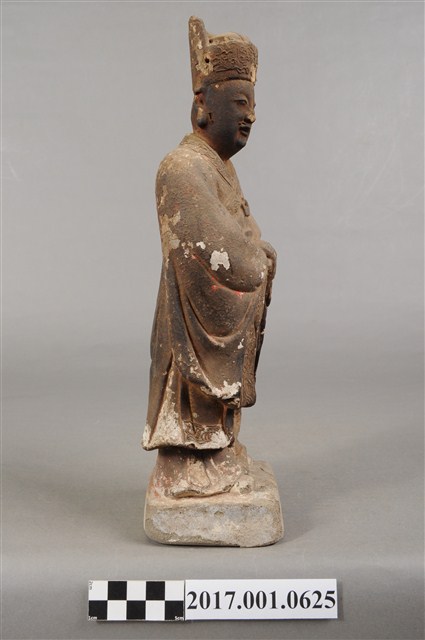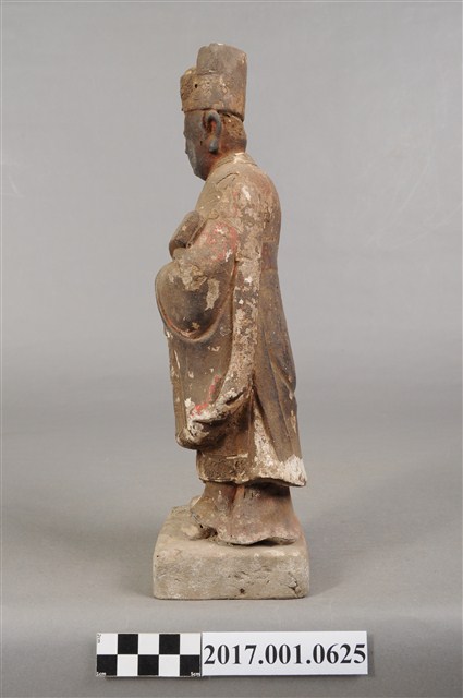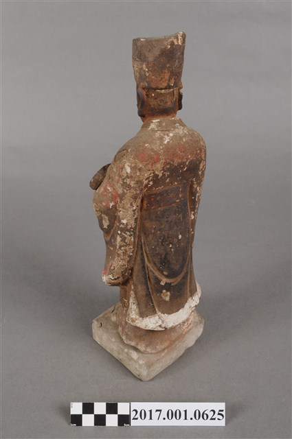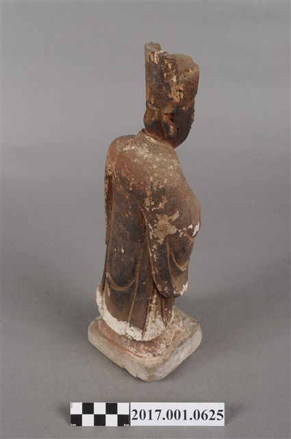 1.本件泥塑周公像,作立姿姿態,表面大多已褪去。頭部側向右,雙目半睁,嘴微開,顏面友植鬚孔,鬍鬚脫落遺失。頭戴忠靖冠,梁冠於正面的顏題處粉線盤飾,上半身著右衽寬袖衣,袖口粉線盤飾衣緣裝飾,腰束腰帶,下半身圍裙裳,裙裳以粉線盤飾鳳凰紋飾,腳穿履。立像挺身以雙腳八字步的姿態站於臺座上,側身向右,雙手藏於衣袖內,左手壓著右手置於腹前,左腋下夾著書冊。臺座作方臺。