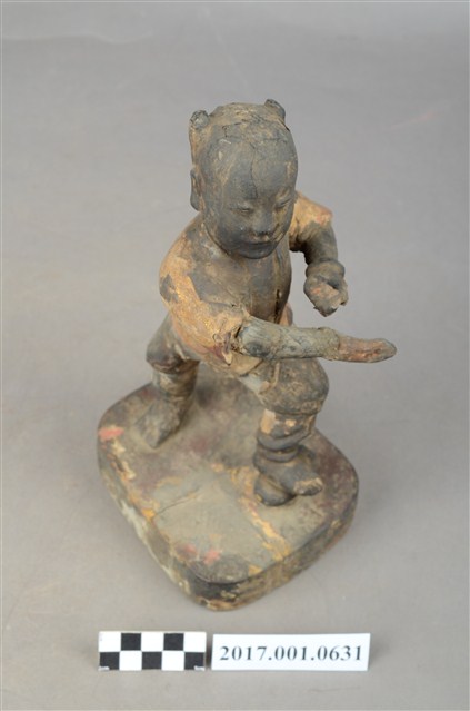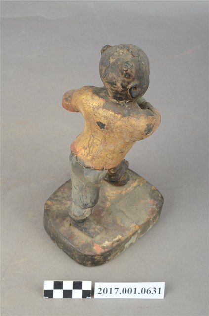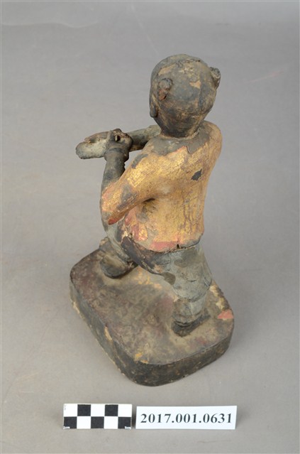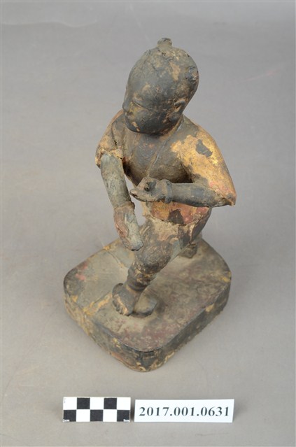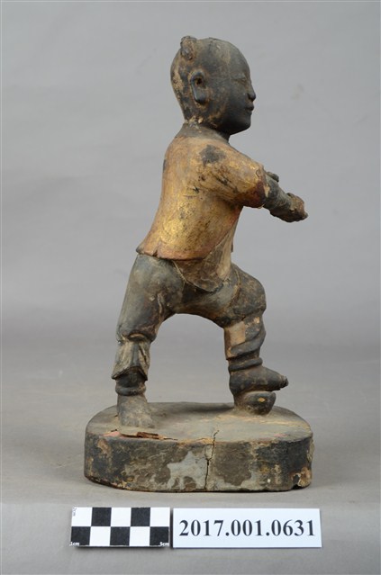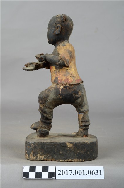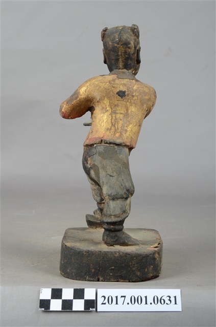 1.本件木雕招財童子像,作立姿姿態,表面施作塗裝、安金不見紅粧佛技法,粧佛大致保存完整。短髮。頭頂兩端梳雙髻,雙眼半睜,嘴微開。上半身著肚兜,外套著短袖罩衫,衣服以安金表現,下半身著長褲,雙手與腳佩戴釧。跣足,立像挺身以雙腳丁字部的姿態站於臺座上,左腳向前踏元寶,右腳在後,左手握拳向前,右手翻掌橫伸向左。
