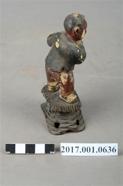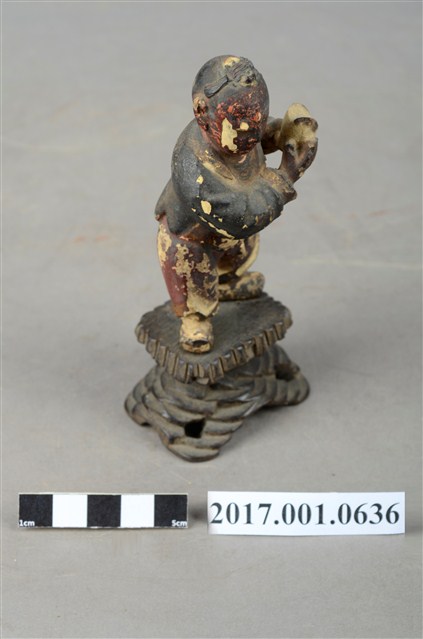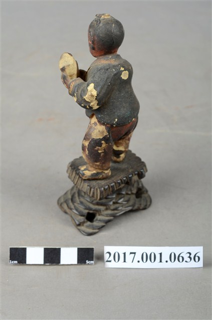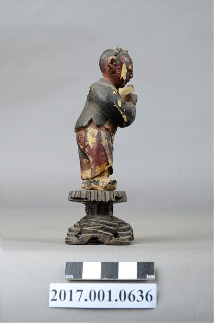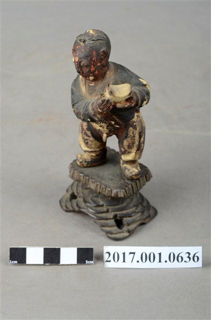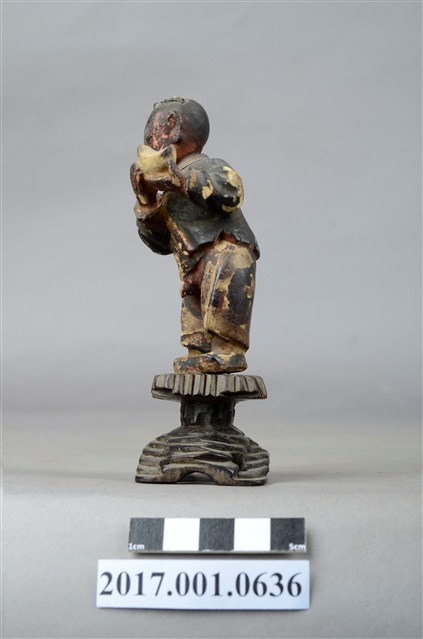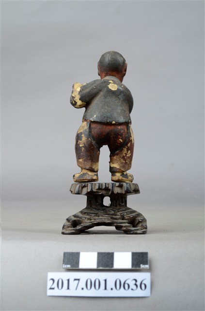 1.本件進寶童子像為木雕製成,表面施以安金工法,表面掉色斑駁,整體造型古樸可愛,應為與別組神像分散。童子頭頂結髻,並以黑色彩繪頭髮,童子圓臉大耳,面貌稚氣,張嘴微笑,模樣可愛。童子外穿布衣,內穿肚兜與開襠褲,露出下體與屁股,布衣上並無紋路裝飾,肚兜則有彩繪紋飾,衣褶線條自然生動。童子側身雙手捧舉元寶,取其進寶之意。童子所站臺座雕刻成交叉石柱,以墊高童子的高度。