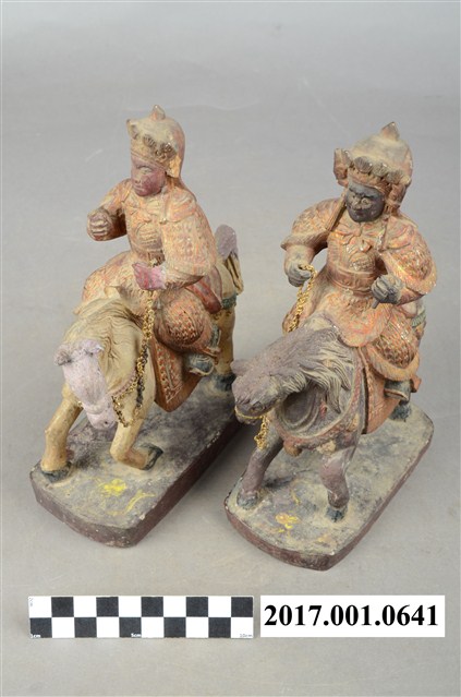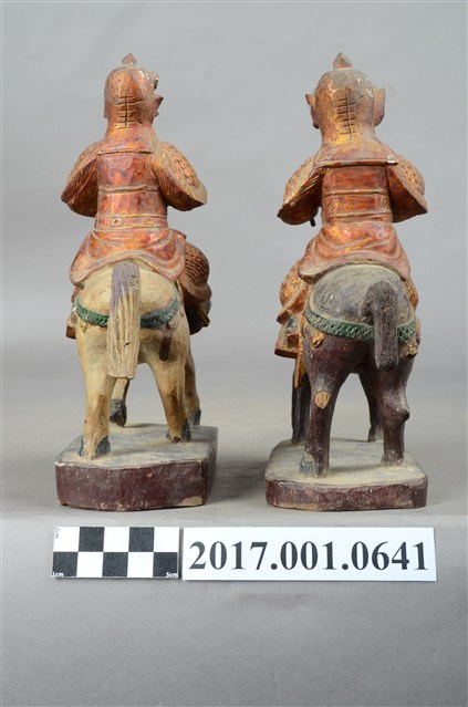 1.本組武將像為二尊,皆作騎馬姿態,表面施以錦雕彩繪技法飾成。騎馬武將互為對照。臉色、馬色一黑一紅,左側武將黑臉表情粗獷,右側武將白臉面貌斯文,身穿甲袍,跨坐馬背上,雕刻精細,乘馬姿態生動。