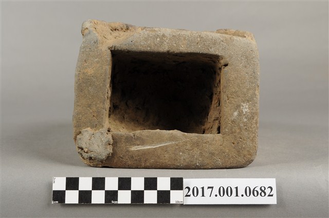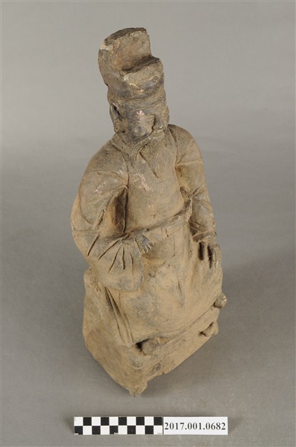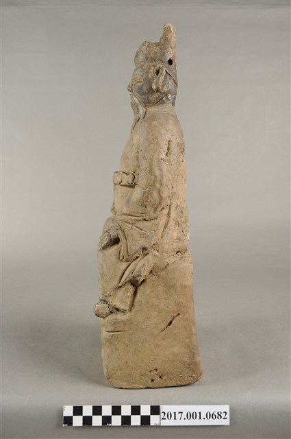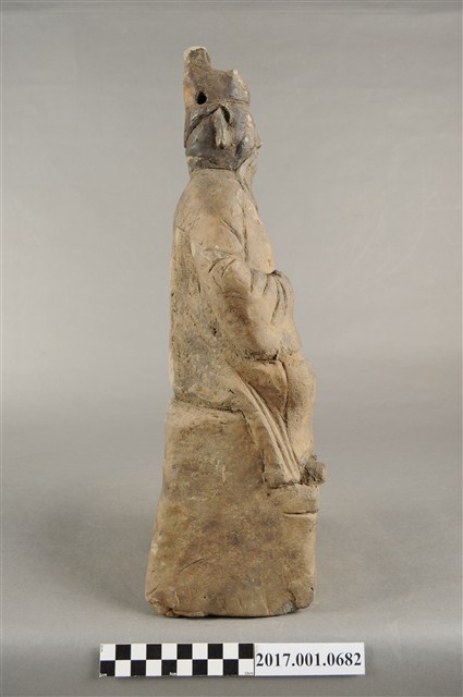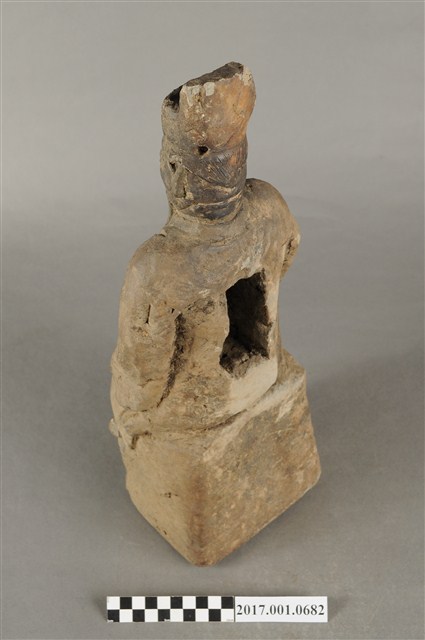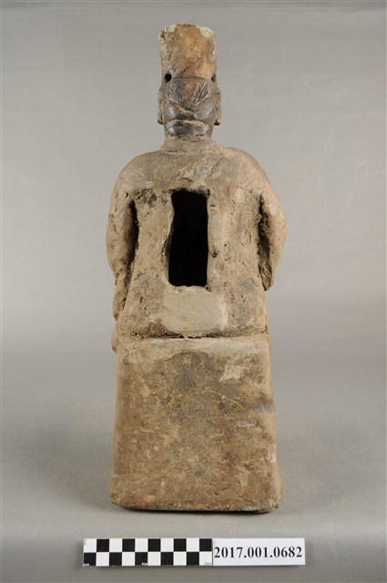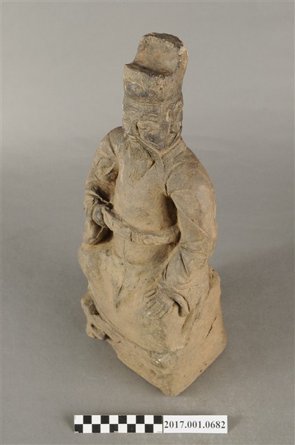 1.本件石雕城隍尊神像採坐姿,城隍尊神端坐於臺座上,表面粧佛已褪去,背後開有長方形入神洞,封榫佚失,洞內物件已取出。城隍尊神作中年男子相貌,雙眼凸出,嘴下雕有鬍鬚,兩側八字鬍凸出。頭戴展翅幞頭,冠後兩側各有一小圓孔,為安裝帽翅處,帽翅已失,身著官袍,胸前束看帶。左手扶於左膝上,右手小臂向內平伸,手握胸前看帶。雙腳踩於踏几上。