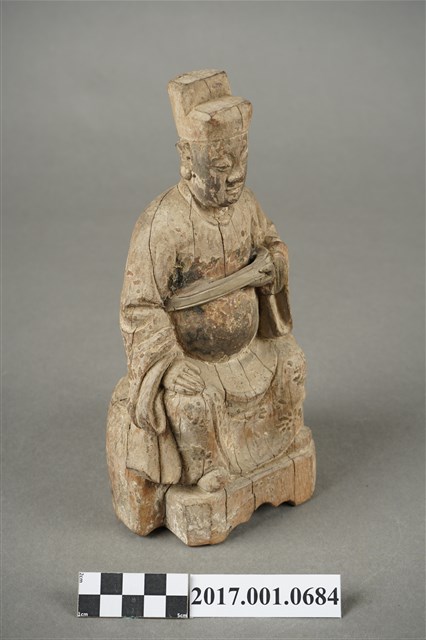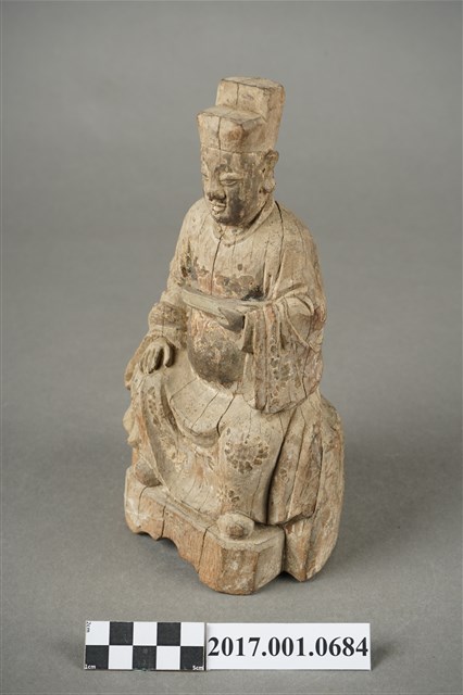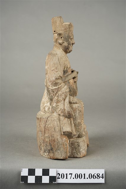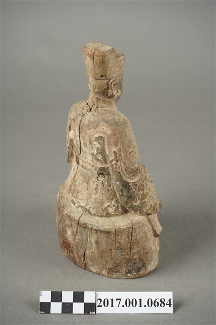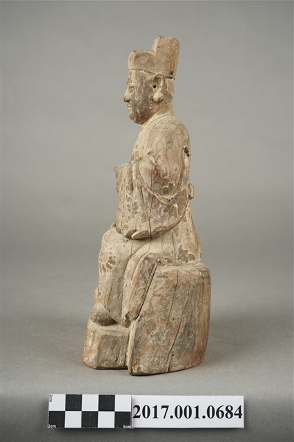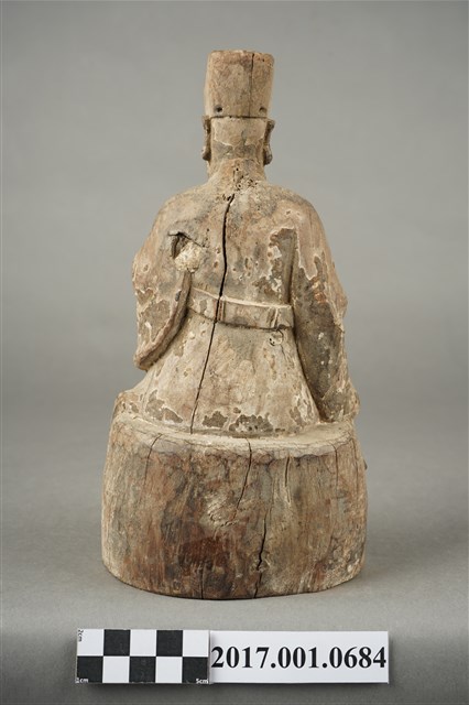 1.本件木雕城隍尊神像採坐姿,城隍尊神端坐於圓臺上,表面粧佛已褪去,鬍鬚脫落,正面帽冠至踏几分佈有縱裂紋。城隍尊神臉部修長,鼻下鑽兩側、嘴下及兩腮鑽有小孔,為植鬍鬚處。頭戴展翅幞頭,帽翅缺損,身著圓領官袍,胸前束看帶。右手扶於右膝上,左手小臂上舉,掌心朝上,托握胸前看帶。雙腳踩於踏几上。