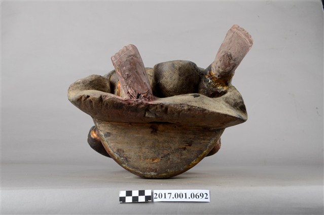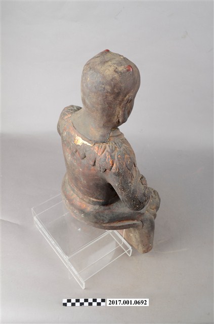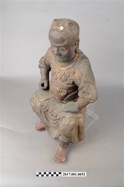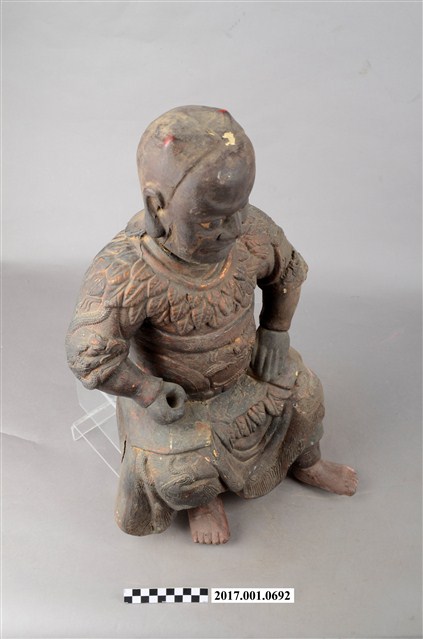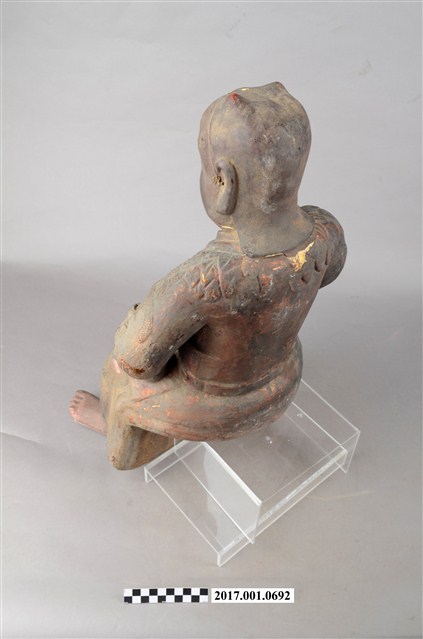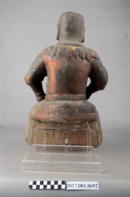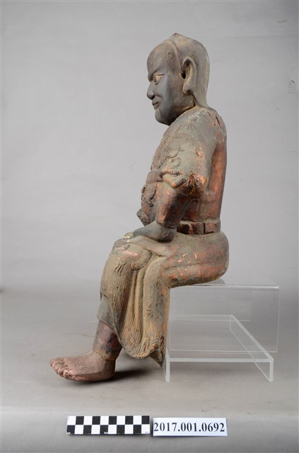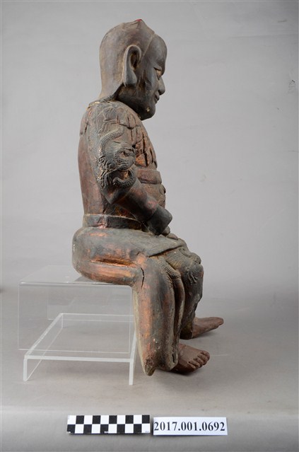 1.本件木雕神農大帝像,作坐姿姿態,坐於臺座上,表面施作塗裝、安金不見紅漆線盤飾,安金剝落嚴重。頭頂雙角,披髮,臉型輪廓橢圓,雙目張眼,法令紋深邃,身著長衫,肩披樹葉草衣,腰束腰帶,下半身著長褲,褲外圍樹葉草衣,袍服漆線盤飾蟒紋等紋飾,雙手佩戴手釧,跣足。挺身端坐,雙足垂下,左腳向斜前方外推、右腳向內,作「文武腳」坐姿,左手掌置於腿上,右手掌握拳持物,持物已失。本件屬於「脫椅」作法,臺座已失。