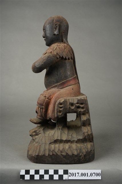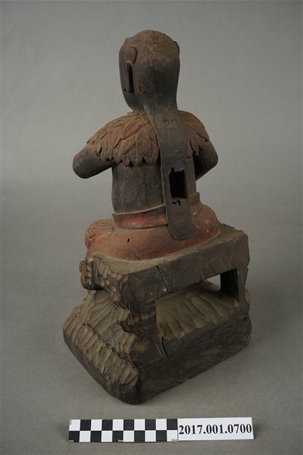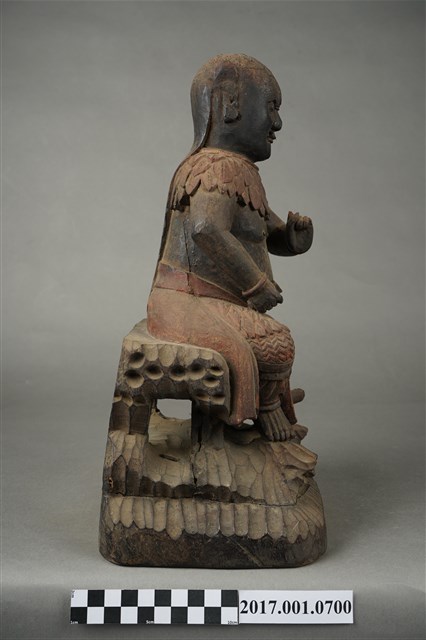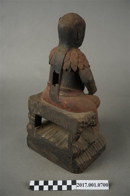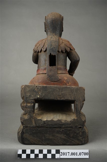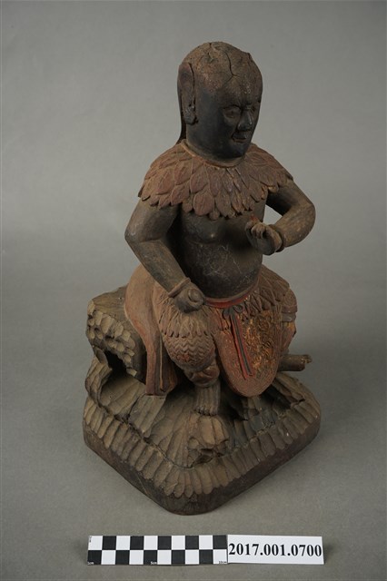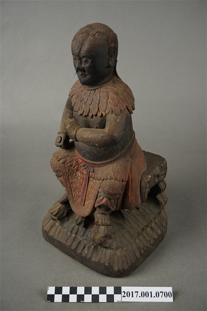 1.本件木雕神農大帝像,作坐姿姿態,坐於岩座上,表面施作塗裝、安金不見紅粉線盤飾粧佛技法。顏面表現皺眉,雙眼瞠目,顴骨與下顎凸出。肩披樹葉草衣,袒胸露乳,肚腹圓凸,下半身著長褲,褲外著鎧甲,圍著裙與樹葉草衣,裙面以粉線盤飾花紋與篆紋。腰繫布帶,雙手佩戴手釧,跣足。挺身端坐,雙足垂下,左腳向斜前方外推、右腳向內,作「文武腳」坐姿,左手橫伸向右,左手手指豎直,以拇指按中指與無名指作道指訣,右手掌握拳持物置於腿上,持物已斷裂缺損。