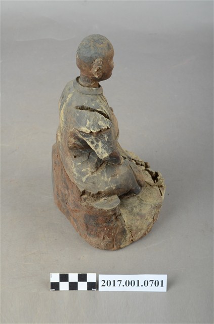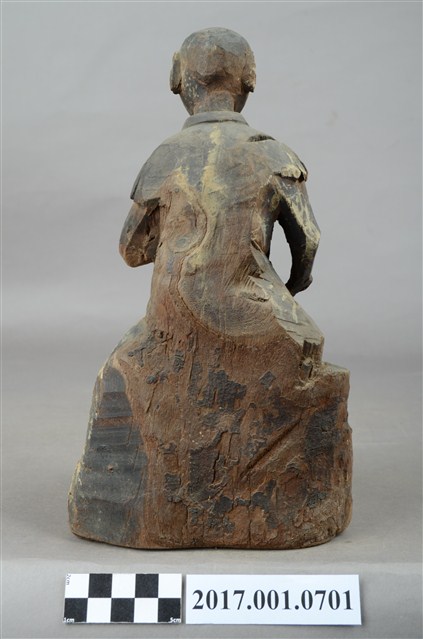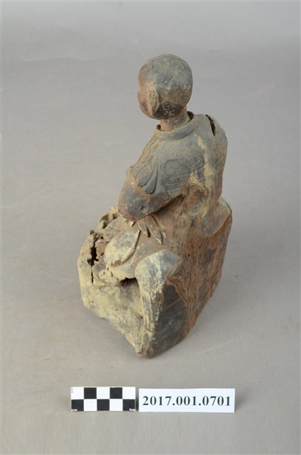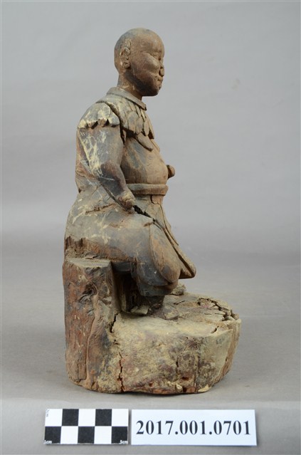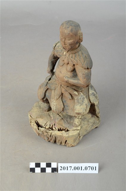 1.本件木雕神農大帝像,作坐姿姿態,坐於岩座上,表面粧佛已褪去。臉型輪廓上圓下尖,雙目半睜,短鼻。肩披樹葉草衣,袒胸露乳,肚腹圓凸,下半圍著樹葉草衣,跣足。挺身端坐,雙足垂下,左手掌橫伸向右,右手向下,雙手的手掌缺損。