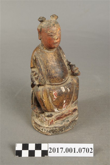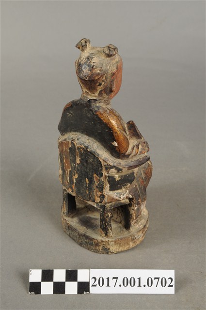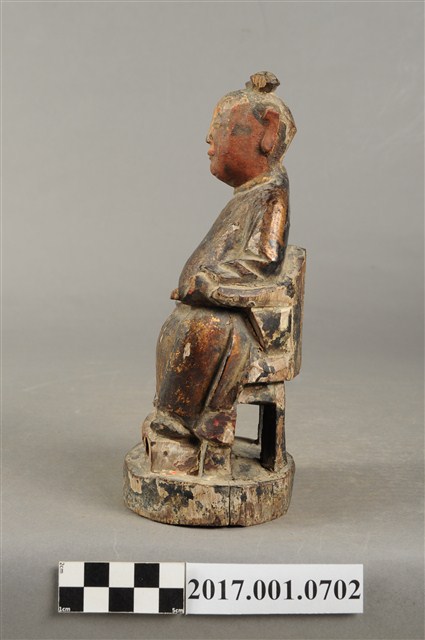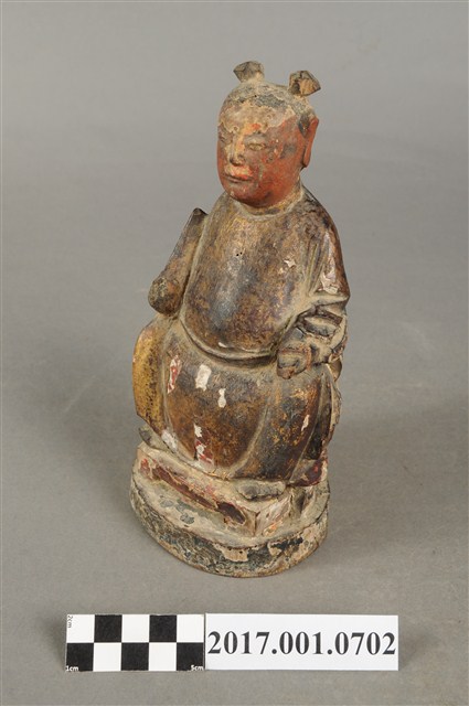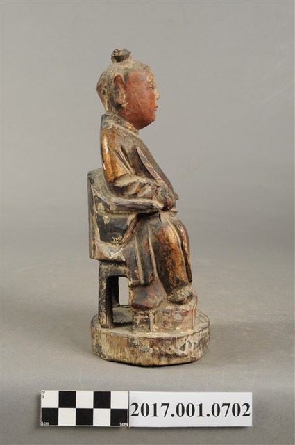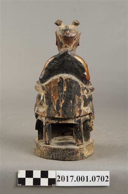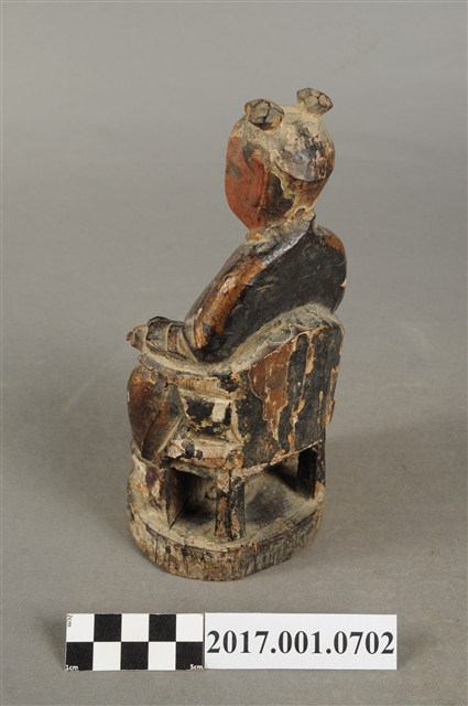 1.本件木雕神農大帝像採坐姿,端坐於圈背椅上,雕工簡潔、袍服線條剛硬,粧佛已褪去,上額及鼻子周邊漆面脫落,袍服下襬有數處較新之不規則形狀剝落,露出底層之白灰、朱漆底色。神農大帝像作年輕男子相貌,朱紅色臉、無鬚,頭頂梳雙朝天髻,身著圓領袍服,腰間束腰帶,作少見的文官服飾造形。左手扶於座椅扶手上,右手持一方笏板置於扶手上,笏板靠於右上背,雙足透出鞋尖,平踏於座前踏几上,臺座作矮圓臺。