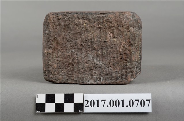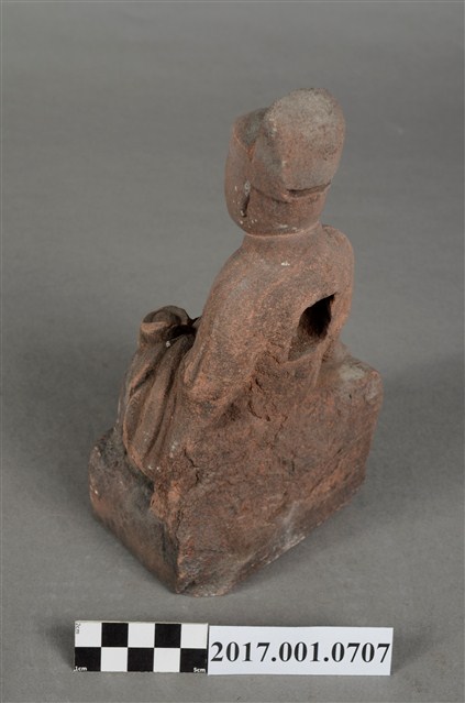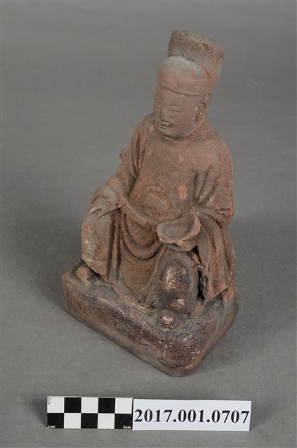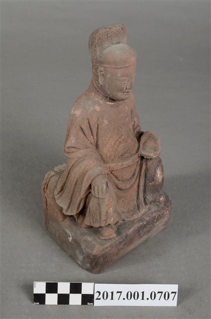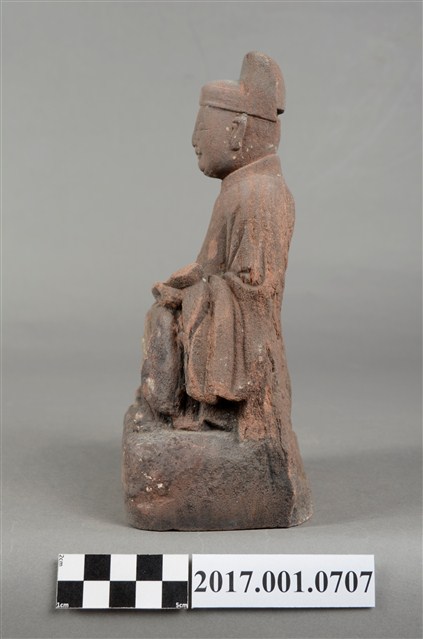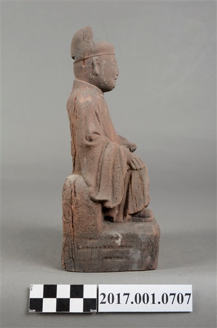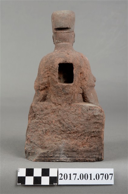 1.本件石雕財神像,作坐姿姿態,端坐於椅凳上,表面粧佛已褪去,背面開有方形入神洞,封榫佚失,內容物件已取出。顏面表現雙目半睜,頭戴幞頭,身著寬袖盤領衣,腰束腰帶,腳穿皂靴。挺身端坐,雙足垂下,左手捧元寶置於腿上,右手掌置於腿上。