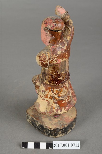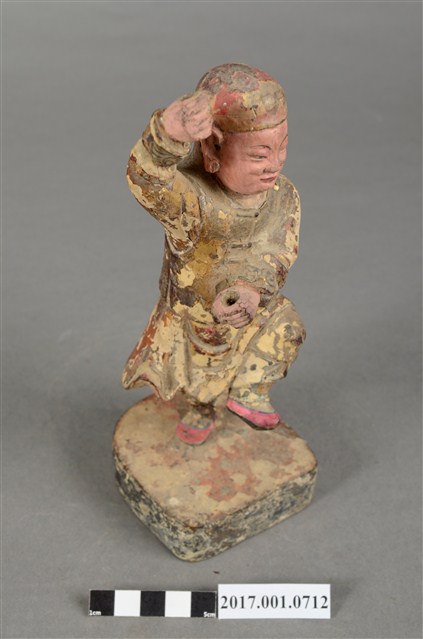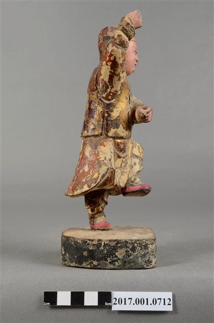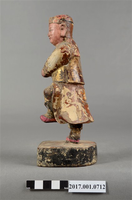 1.本件木雕馬使爺像,作立姿姿態,表面施作塗裝、安金不見紅粧佛技法,背面開有方形入神洞,封榫尚存。張眼,墨線勾勒眉毛、睫毛、眼珠、魚尾紋。頭戴圓巾,身著過膝長衫,外罩馬掛,長衫與馬褂以安金表現,雙腿穿長褲,腳穿紅鞋。立像挺身站於臺座上,右腳單腳立地,左腳屈膝抬起,左手向右平抬,右手向上高舉,雙手虛握,手中持物已失。